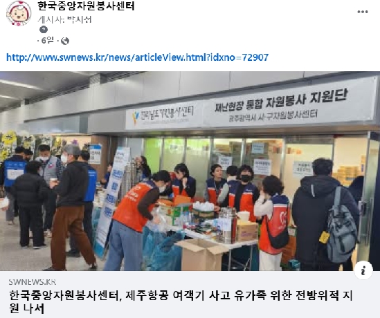 [한국중앙자원봉사센터, 제주항공 여객기 사고 유가족 위한 전방위적 지원나서]