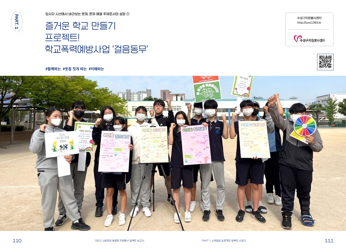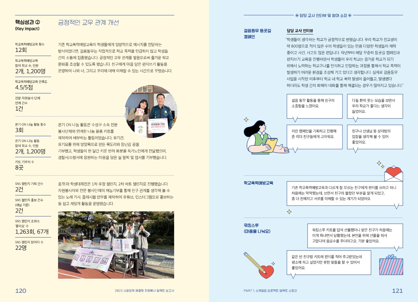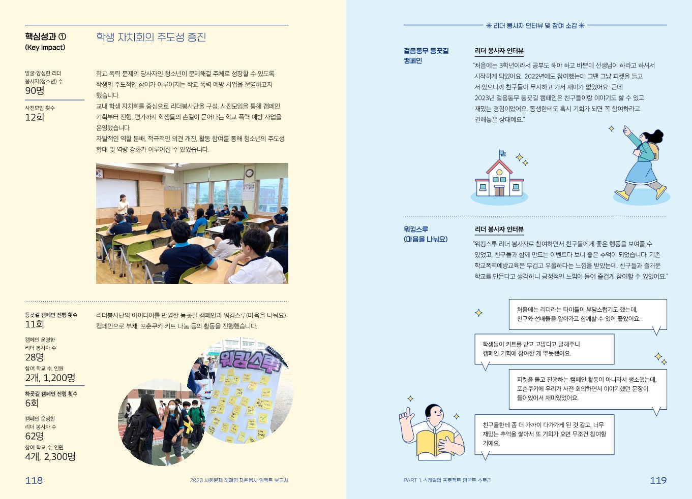임팩트 스토리 [스케일업 프로젝트] 즐거운 학교 만들기 프로젝트! 학교 폭력 예방 사업 ‘걸음 동무’ 관리자 2024.02.08 428 이전글 [스케일업 프로젝트] 대학가 쓰레기 불법투기 개선을 위한 청년들아, 치워랍(Cheer up)! 목록 다음글 [스케일업 프로젝트] 주민 주도적 안전마을 조성 사업 '마을을, 잇(it)다(all)' : 연결하다