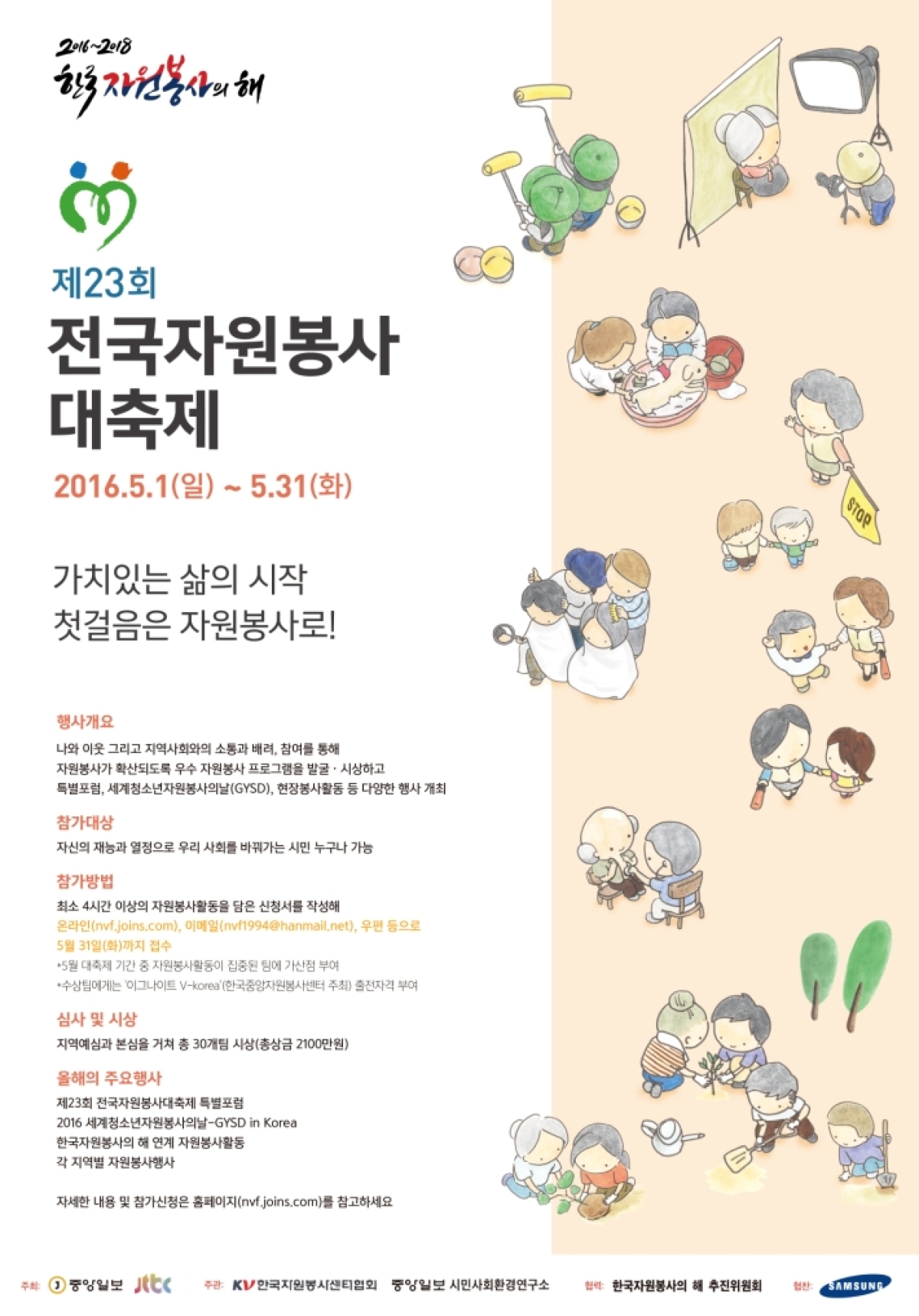 전국자원봉사대축제는 대한민국에 살아가는 시민, 가족, 기업, 학생, 단체들이 참여하는 자원봉사야말로 우리 사회를 건강하게 만들어 가는 힘이라는 사실을 지역사회에 널리 알려내는 자원봉사 홍보의 장입니다. 이번 전국자원봉사대축제는 2016~2018년까지 3년간 진행되는 '한국자원봉사의 해'에 맞춰 지난 22년간의 전국 자원봉사대축제의 노력가 성과를 바탕으로 연대와 협력을 강화했다고 합니다. 더 커진 제 23회 전국자원봉사대축제에 도전해보세요.