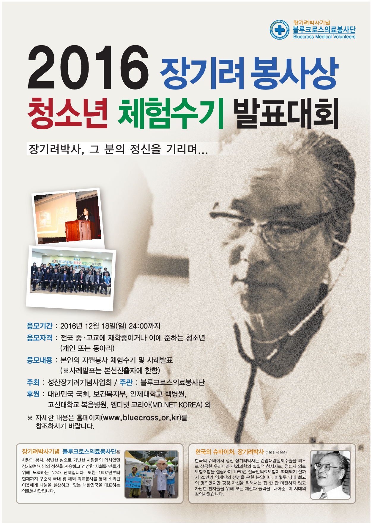 정보공유 [안내] 제4회 장기려봉사상 청소년체험수기 발표대회 안내 관리자 2016.12.09 5270 * 자세한 내용과 응모양식은 홈페이지(http://www.bluecross.or.kr/) 을 참고하시기 바랍니다. 이전글 [홍보] 라이나전성기재단 지원사업 공모 신청안내 목록 다음글 [홍보] 자원봉사센터의 기업 자원봉사 전문가 양성과정 '기업 자원봉사 리더스쿨' 참가자 모집
