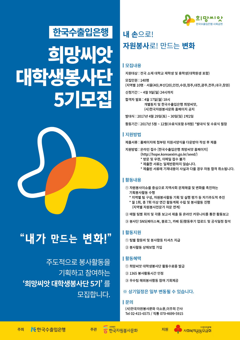[홍보] 한국자원봉사문화, 한국수출입은행과 함께 하는 희망씨앗 대학생봉사단 5기 모집