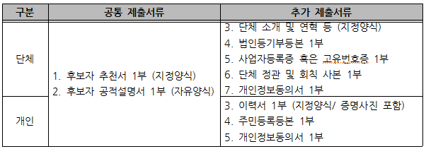 - 선발은 서류심사로 진행되며 후보자의 추천 및 심사에 관한 사항은 외부에 공개되지 않음