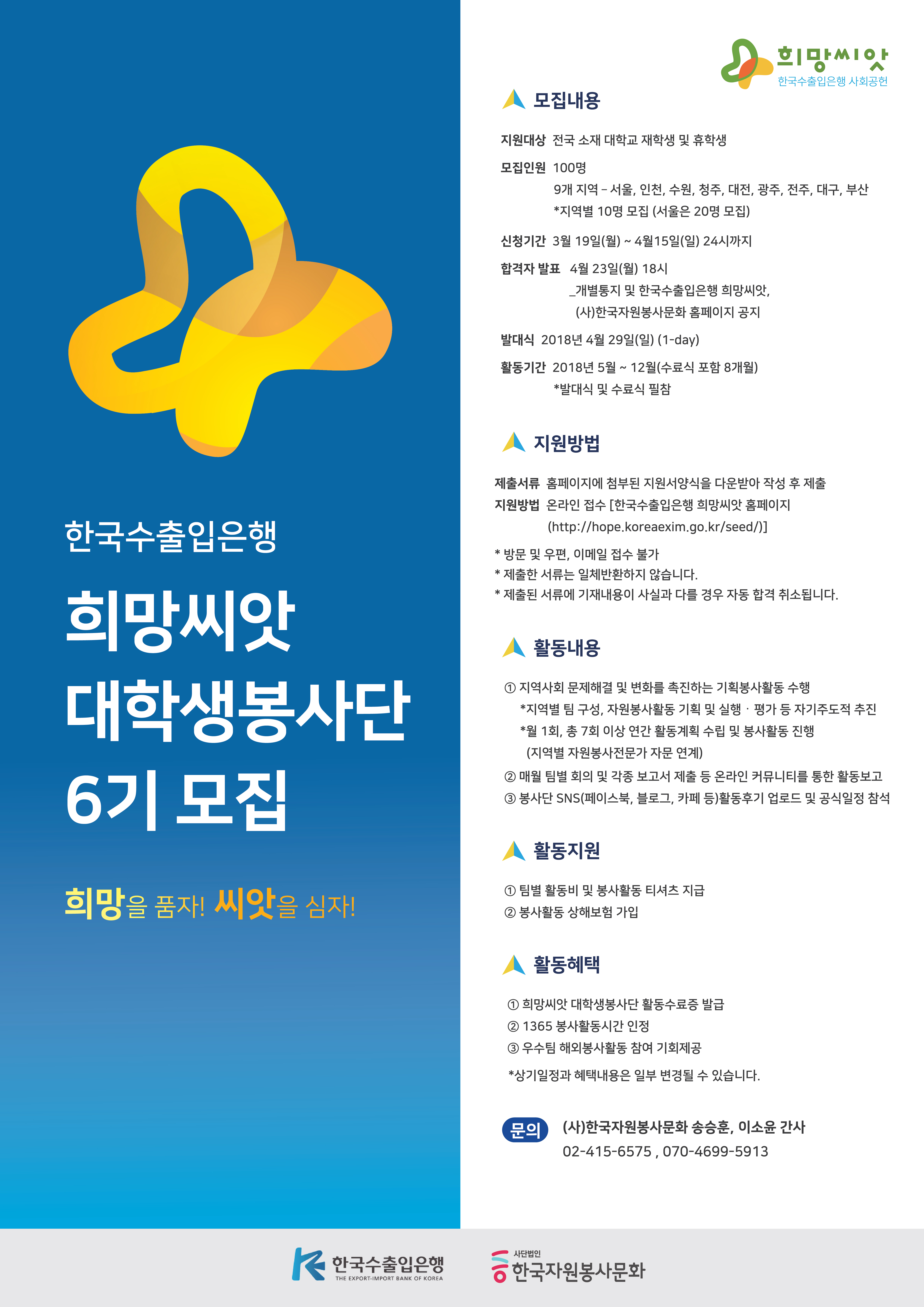 [홍보] (사)한국자원봉사문화와 한국수출입은행이 함께하는 희망씨앗 대학생 봉사단 6기 모집