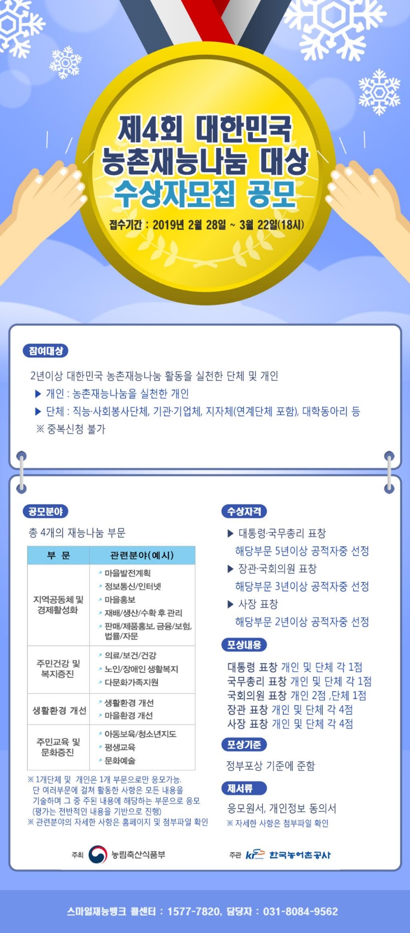 정보공유 [홍보] 제4회 대한민국 농촌재능나눔 대상 수상자 모집 공모 관리자 2019.03.08 2218 ※ 접수 및 자세한 내용은 https://www.smilebank.kr/award/lay2/S559T559C561/contents.do 를 통해 확인 하기시 바랍니다. 이전글 [홍보] 제100회 전국체육대회&제39회 전국장애인체육대회 자원봉사자 모집 목록 다음글 [홍보] 2019년 제2기 공무원 및 공공기관 직원 사이버 통일교육 수강 안내