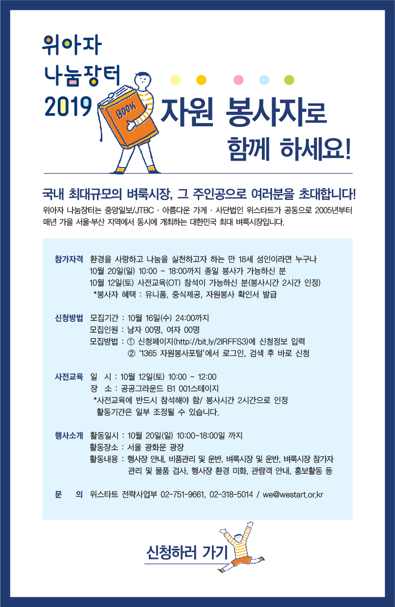 정보공유 [홍보] 위아자 나눔장터 2019 자원봉사자 모집 관리자 2019.09.20 2814 이전글 [공지] 은둔환자 의료지원 캠페인 목록 다음글 [홍보] 2019 한국형 온라인 공개강좌(K-MOOC) ‘자원봉사 시민교육을 말하다’