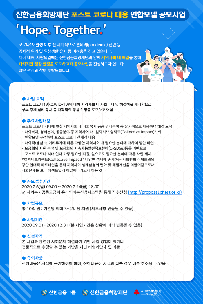 정보공유 [홍보] 2020 신한금융희망재단 지역사회 포스트코로나 대응 'Hope Together' 공모 사업 관리자 2020.07.08 1697 이전글 [홍보] 해피무브 - 내가 만드는 봉사 FLEX 목록 다음글 [홍보] 2020년 사회복지자원봉사 따뜻한 영상(자유, 프로그램) 및 이야기 공모전