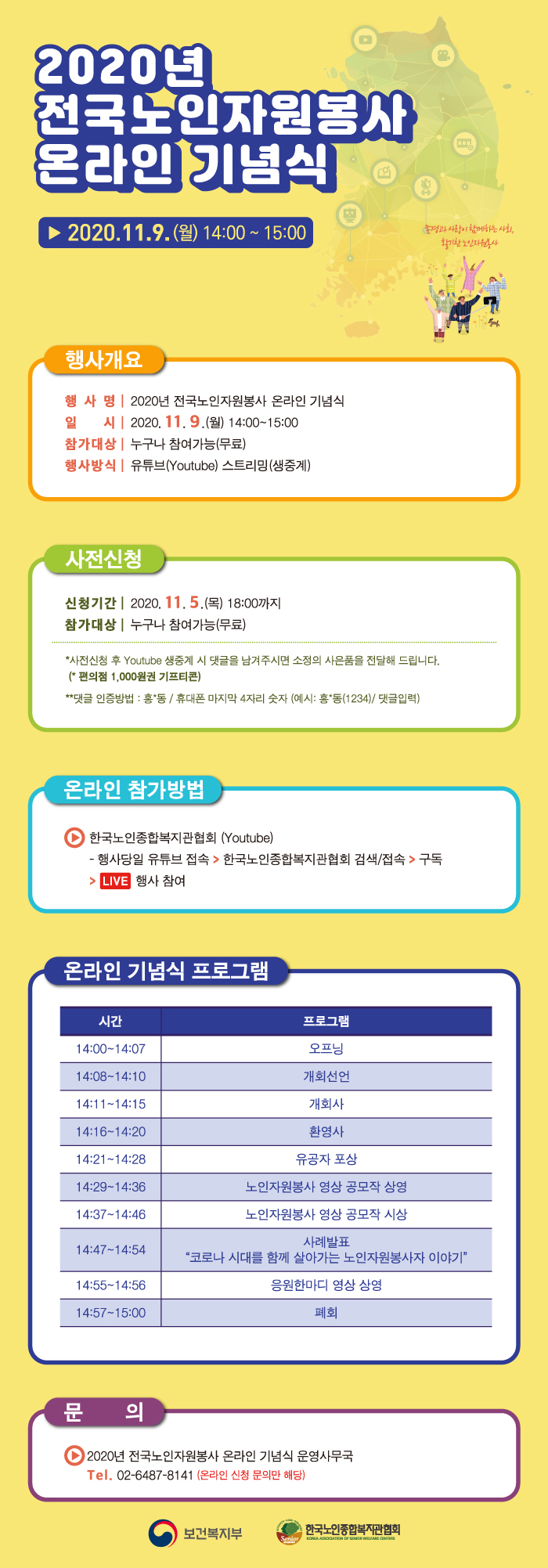 정보공유 [홍보] 2020년 전국노인자원봉사 온라인 기념식 사전신청 협조안내 관리자 2020.11.03 1547 이전글 [홍보] 위드 코로나 시대 안전한 서울을 만드는 재난 안전 컨퍼런스 목록 다음글 [홍보] 언택트 자원봉사 아이디어 공모전