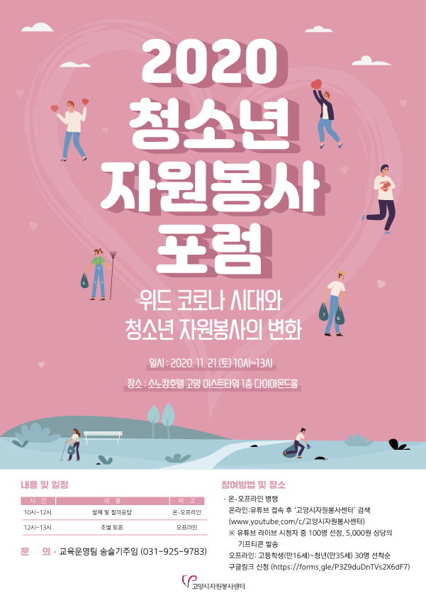 정보공유 [홍보] 2020 청소년 자원봉사 포럼 ‘위드코로나 시대와 청소년 자원봉사활동의 변화’ 관리자 2020.11.10 1709 이전글 [홍보] 2020 모두 다 토론회 목록 다음글 [홍보] 청소년자원봉사활동 활성화를 위한 대국민 아이디어 공모전