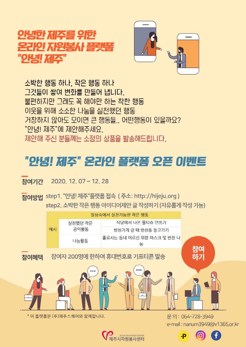 정보공유 [홍보] 안녕! 제주 플랫폼 오픈이벤트 관리자 2020.12.14 1776 이전글 [홍보] 「도움기관정보」 홍보물 활용 안내 목록 다음글 [홍보] 2020년 성인대상 종합예술 과학공연 SiZE 공연 상영 안내