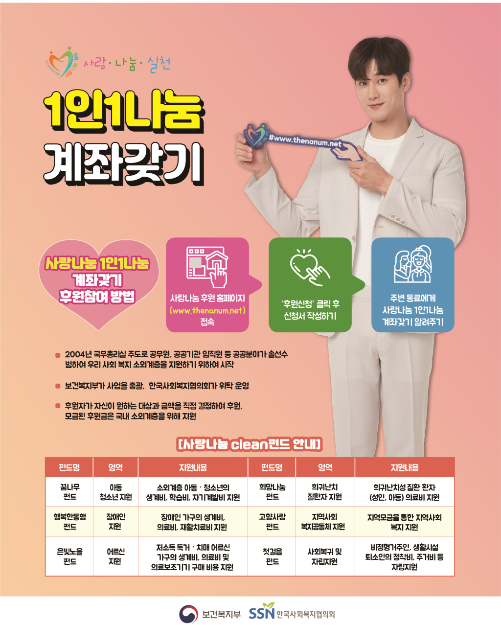 정보공유 [홍보] 사랑나눔 실천을 위한 1인 1나눔 계좌갖기 관리자 2021.03.31 1733 이전글 [홍보] 제23회 전국중고생자원봉사대회 응모 접수 목록 다음글 [홍보] 제6회 대한민국 농촌재능나눔대 대상 수상자 모집