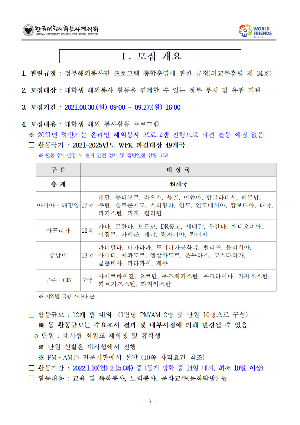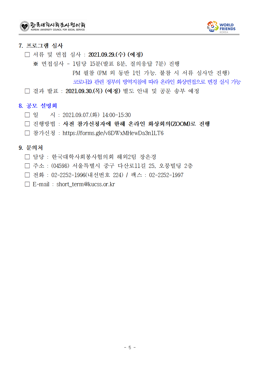 정보공유 [홍보] 41기 월드프렌즈 청년봉사단 전문기관 프로그램 공모 관리자 2021.09.06 1538 이전글 (공고_홍보) 달서구자원봉사센터 위탁운영법인 모집 목록 다음글 [홍보] 2021 고양시 기후변화와 자원봉사 포럼 개최