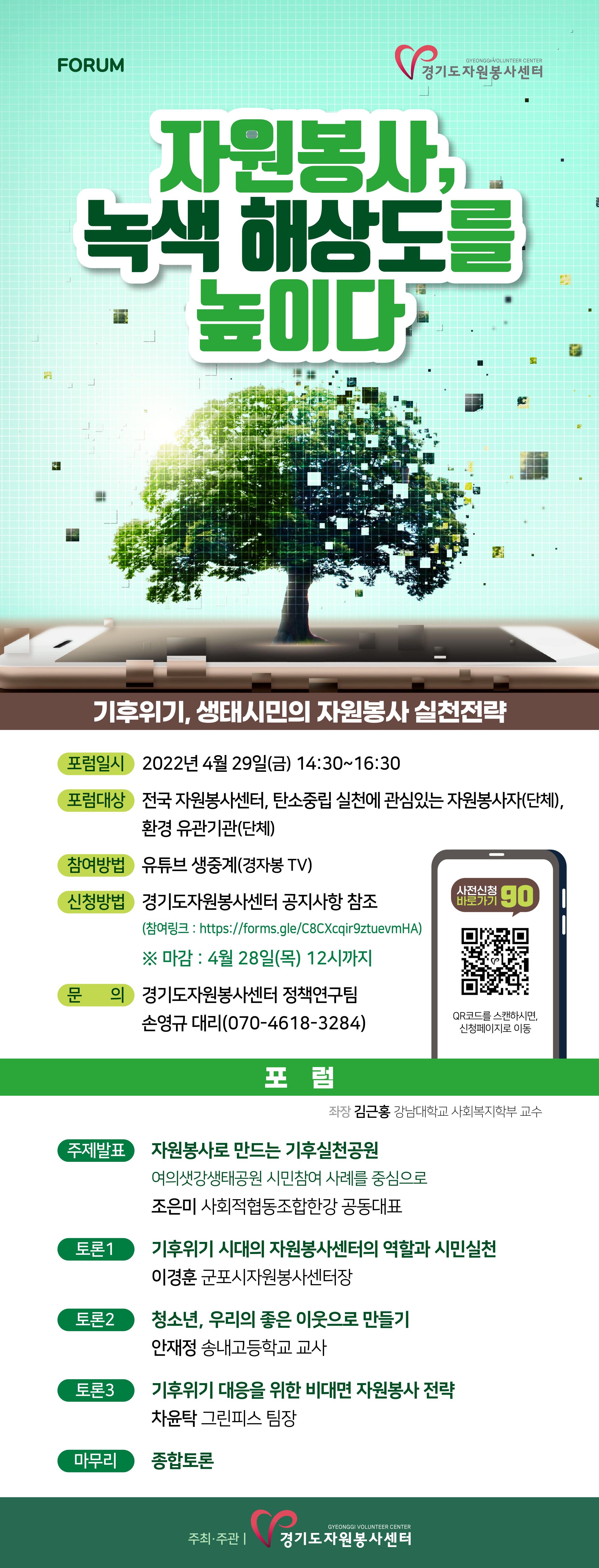 정보공유 [홍보] 경기도자원봉사센터 주최 2022년 '자원봉사, 녹색 해상도를 높이다' 포럼 참여 안내 관리자 2022.04.14 1350 이전글 [홍보] 제24회 전국중고생 자원봉사대회 목록 다음글 [홍보] 2022 푸르덴셜 조혈모프렌즈 1기 모집 안내