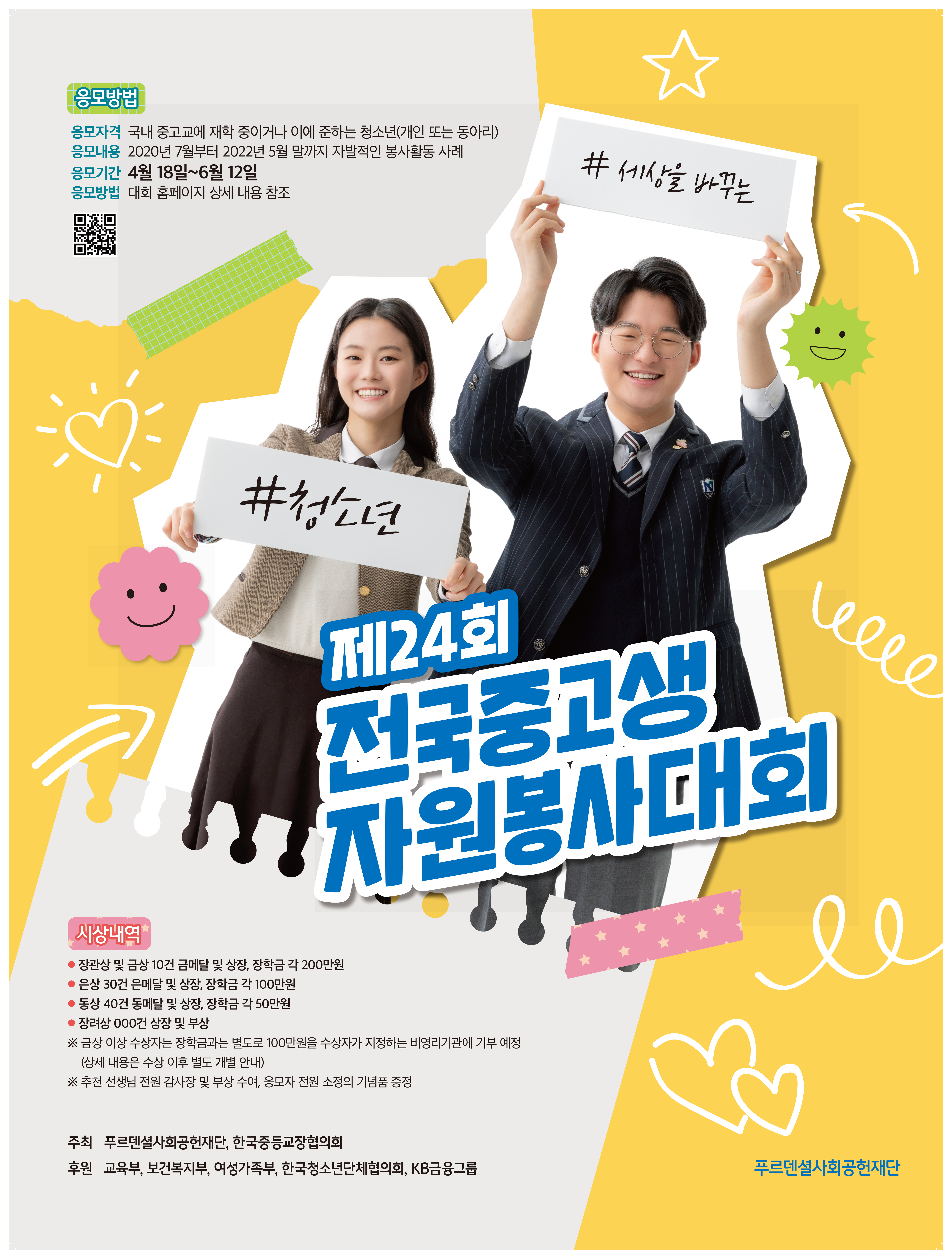 정보공유 [홍보] 제24회 전국중고생 자원봉사대회 관리자 2022.04.27 1402 이전글 [홍보] 제5회 대한민국주거복지문화대상 목록 다음글 [홍보] 경기도자원봉사센터 주최 2022년 '자원봉사, 녹색 해상도를 높이다' 포럼 참여 안내