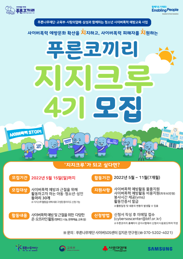 정보공유 [홍보] 2022 청소년 사이버폭력 예방교육 사업 "푸른코끼리" 지지크루(동아리) 모집 안내 관리자 2022.05.10 1265 이전글 [모집] 2022년 ‘꿈과 사람속으로’ 청소년해외자원봉사단 참가자 모집 안내 목록 다음글 [모집] 2022 대구컬러풀페스티벌 프로그램 참여자 모집 안내