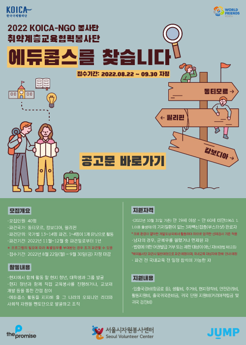 정보공유 [홍보] 글로벌 '교육협력봉사단 Edu_Corps' 모집 안내 관리자 2022.09.15 1380 이전글 [홍보] 자원봉사V 써니데이즈 댄스챌린지 참여하고 푸짐한 상품 GET 하자! 목록 다음글 [홍보] 「추석맞이 소외계층을 위한 1인 1나눔 캠페인」
