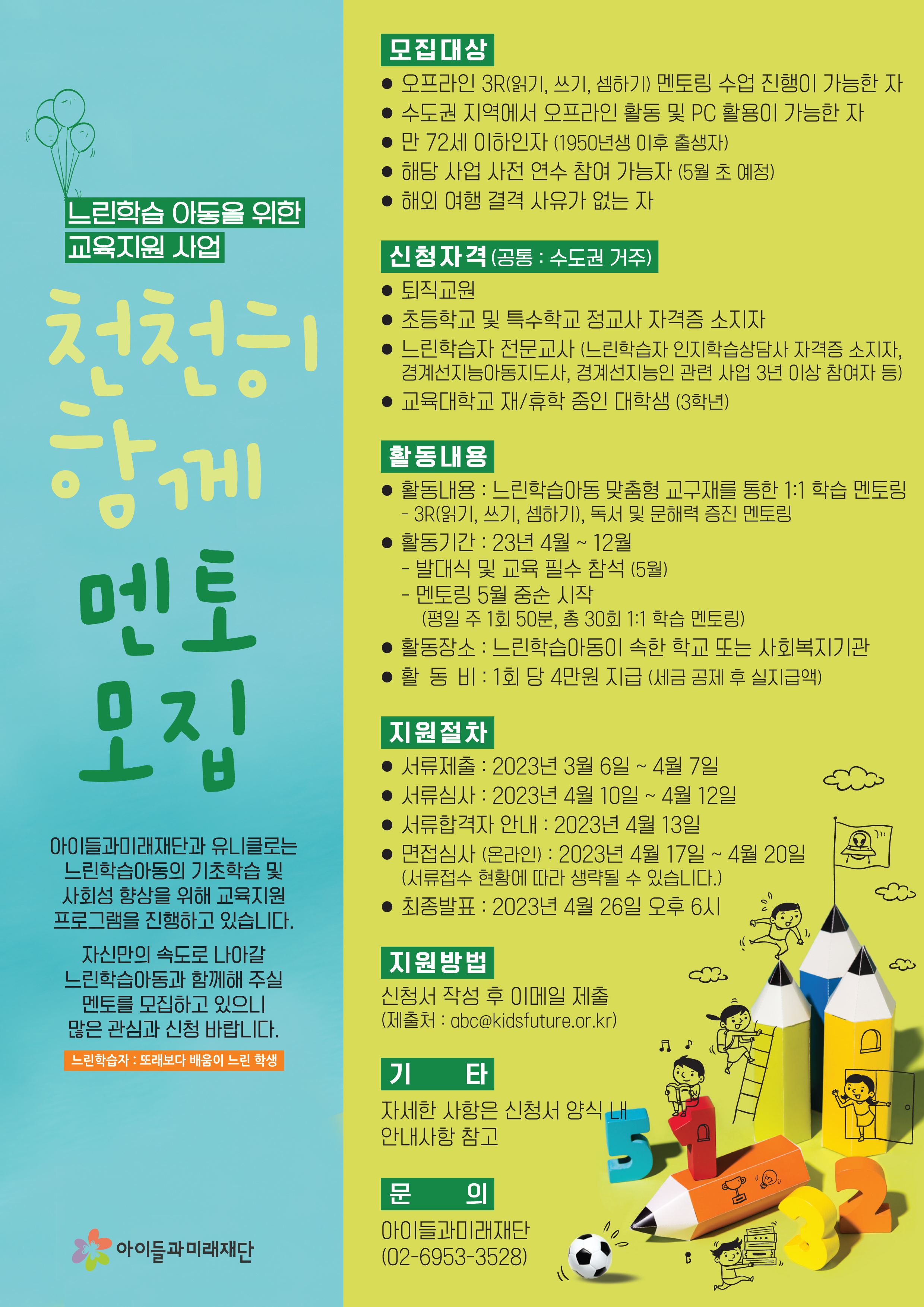 정보공유 [모집] 느린학습 아동을 위한 교육지원 사업 「천천히 함께 멘토」 모집 안내 관리자 2023.03.09 1301 이전글 [홍보] 제47회 청백 봉사상 후보자 공모 목록 다음글 [모집] 신중년 디지털 인지코치 활동 자원봉사자 모집 안내