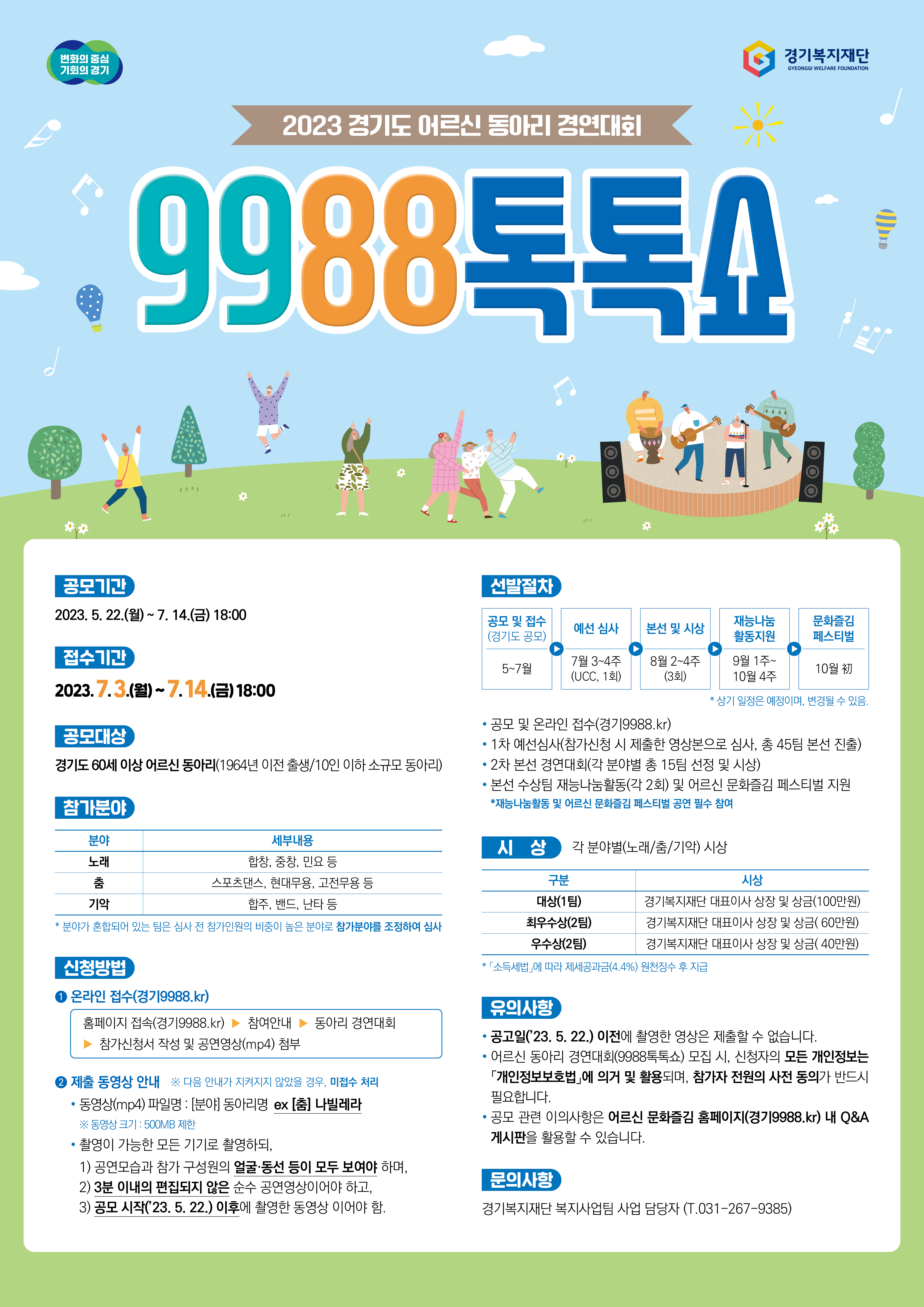 정보공유 [홍보] 2023년「경기도 어르신 동아리 경연대회(9988톡톡쇼)」 관리자 2023.05.26 1353 이전글 [홍보] 2023년 「경기도 어르신 작품공모전」 안내 목록 다음글 [홍보] 2023 한국자원봉사학회 전기학술대회 [청년, 사회적 주체로서 자원봉사 여정을 떠나다!]