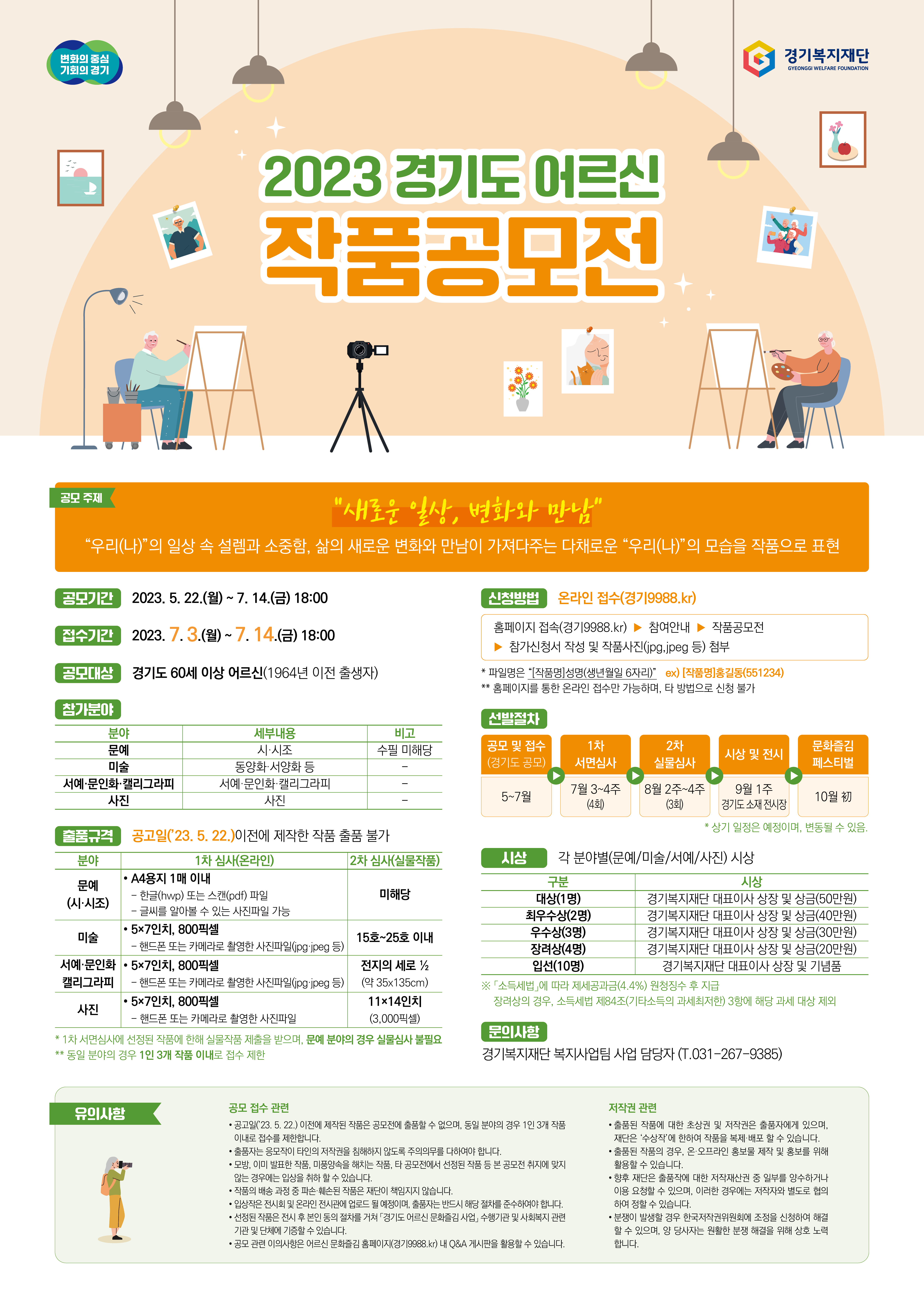 정보공유 [홍보] 2023년 「경기도 어르신 작품공모전」 안내 관리자 2023.06.12 1256 이전글 [모집] 「그린피스 플콕조사」 참여 자원봉사자 모집 안내 목록 다음글 [홍보] 2023년「경기도 어르신 동아리 경연대회(9988톡톡쇼)」