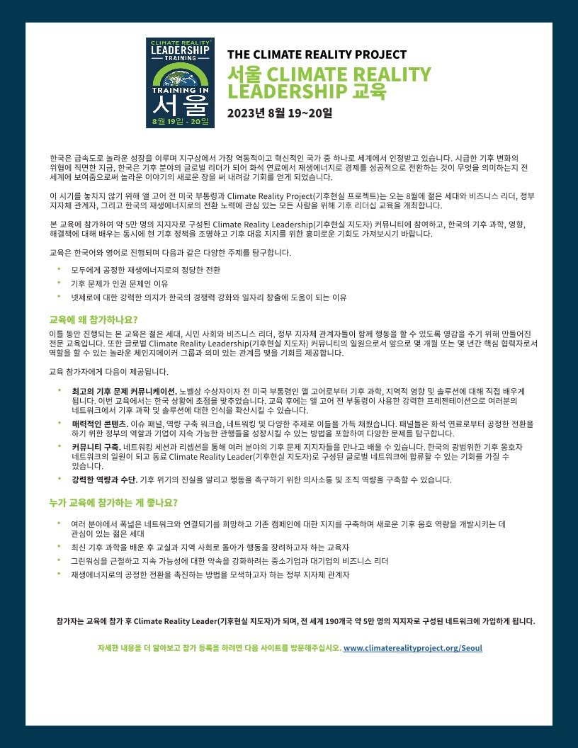 정보공유 [홍보] Al Gore 국제환경NGO 2023년 서울 기후현실 리더 모집 및 양성교육 행사 안내 관리자 2023.07.19 1323 이전글 [홍보] 2023년 제2회 사회복지정책 심포지엄 개최 및 참여 신청 안내 목록 다음글 [홍보] 2023 선진교통안전대상 공모 안내