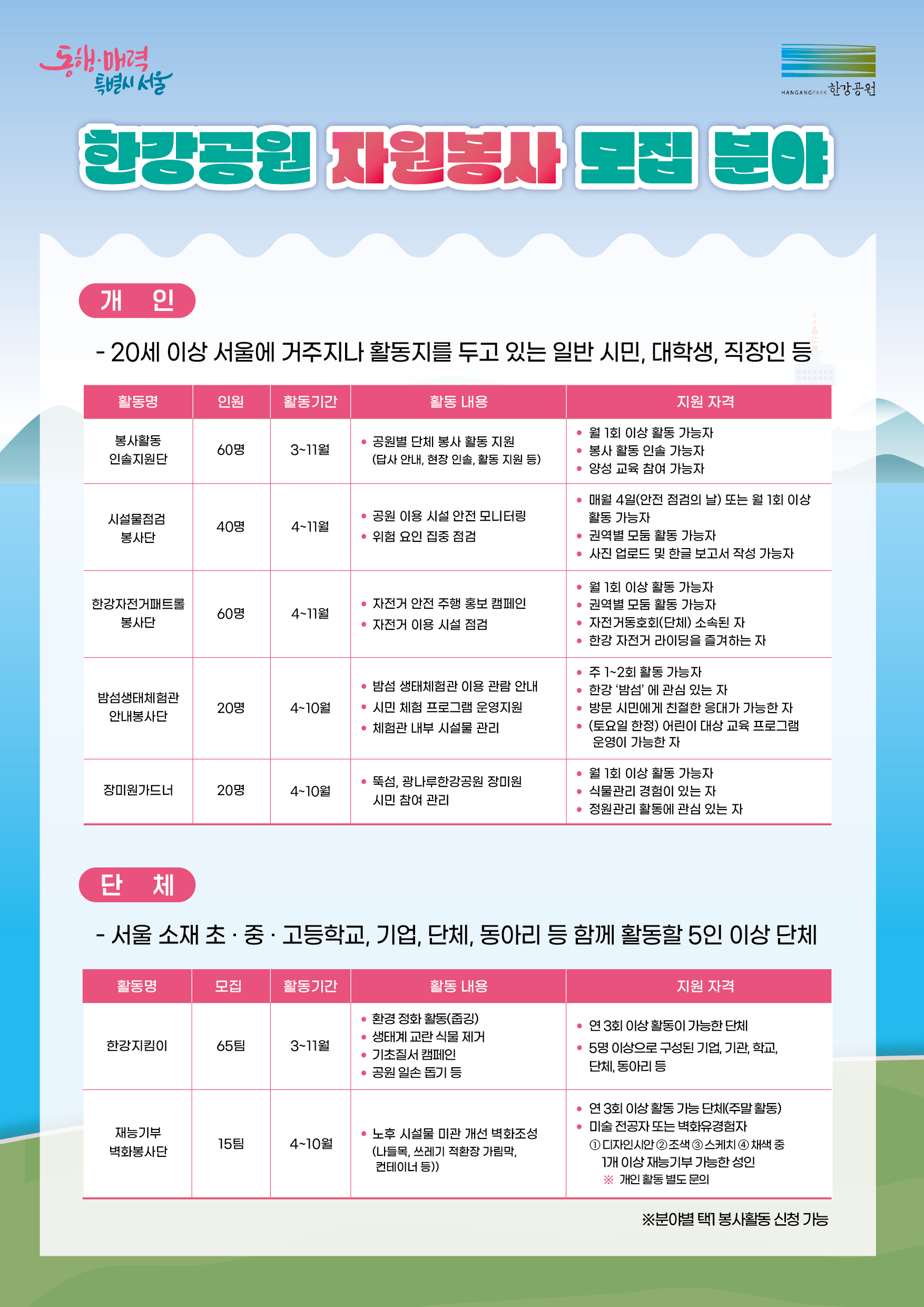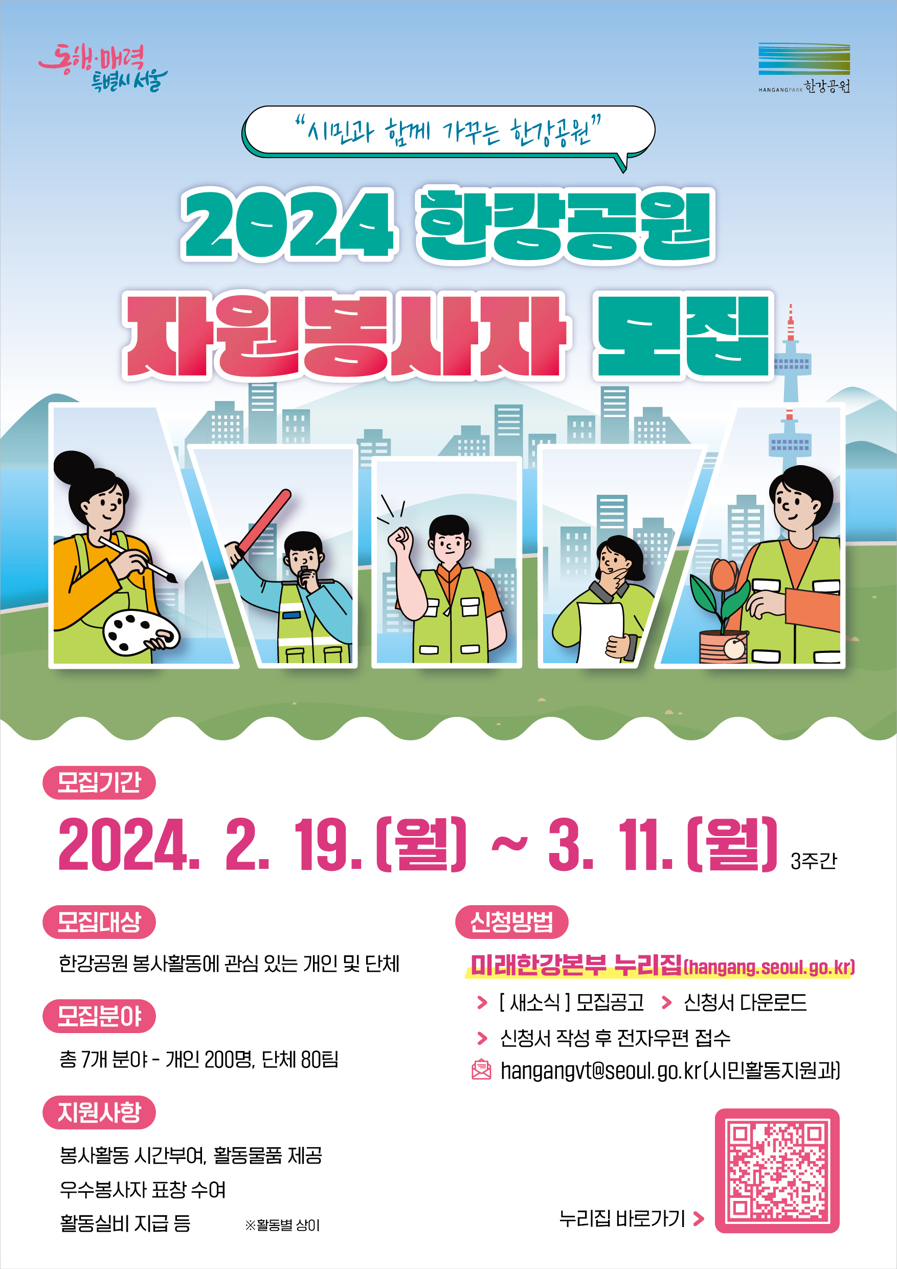 정보공유 [모집] 2024 한강공원 자원봉사자 모집 관리자 2024.02.20 1195 이전글 [홍보] 2024년도 농촌재능나눔(농촌맞춤형봉사활동지원) 일반/지역단체 활동지원사업 공모 목록 다음글 [공유] 스케일업 프로젝트 임팩트 보고서 발간 안내