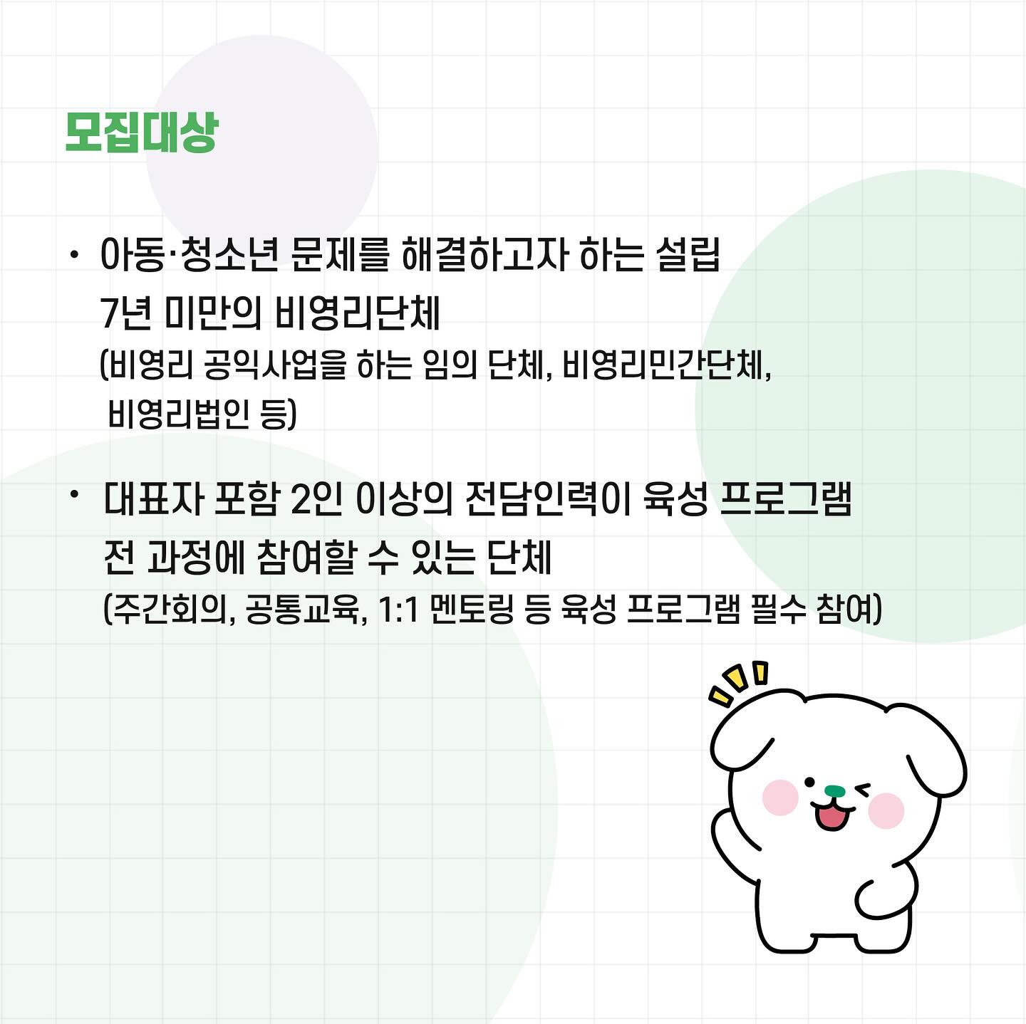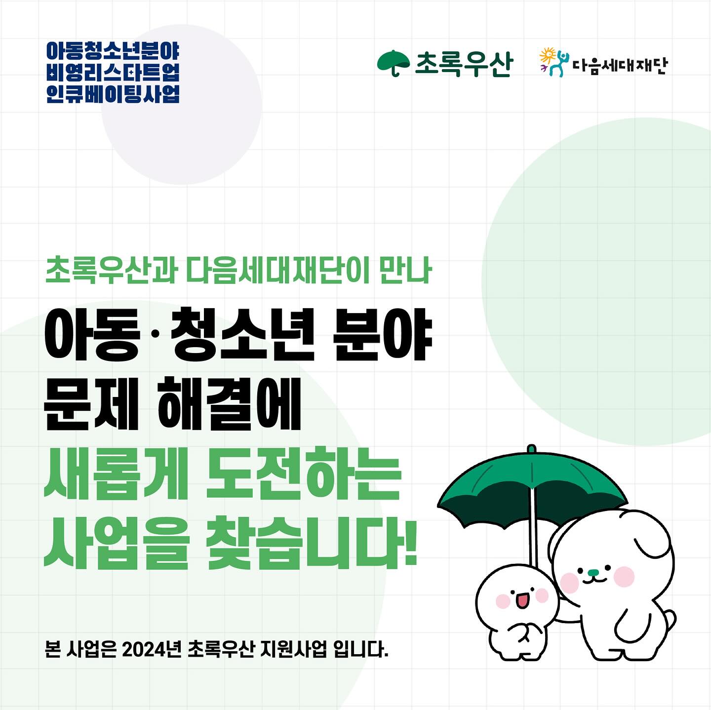 정보공유 [홍보] 2024 초록우산X다음세대재단 '아동・청소년 비영리스타트업 인큐베이팅 사업' 공고 관리자 2024.03.04 1245 이전글 [홍보] 2024년 WFK 청년봉사단 전문기관 프로그램 공모 목록 다음글 [홍보] 「2024 김해올래! 김해 볼런투어」 참가 신청(선착순 모집)