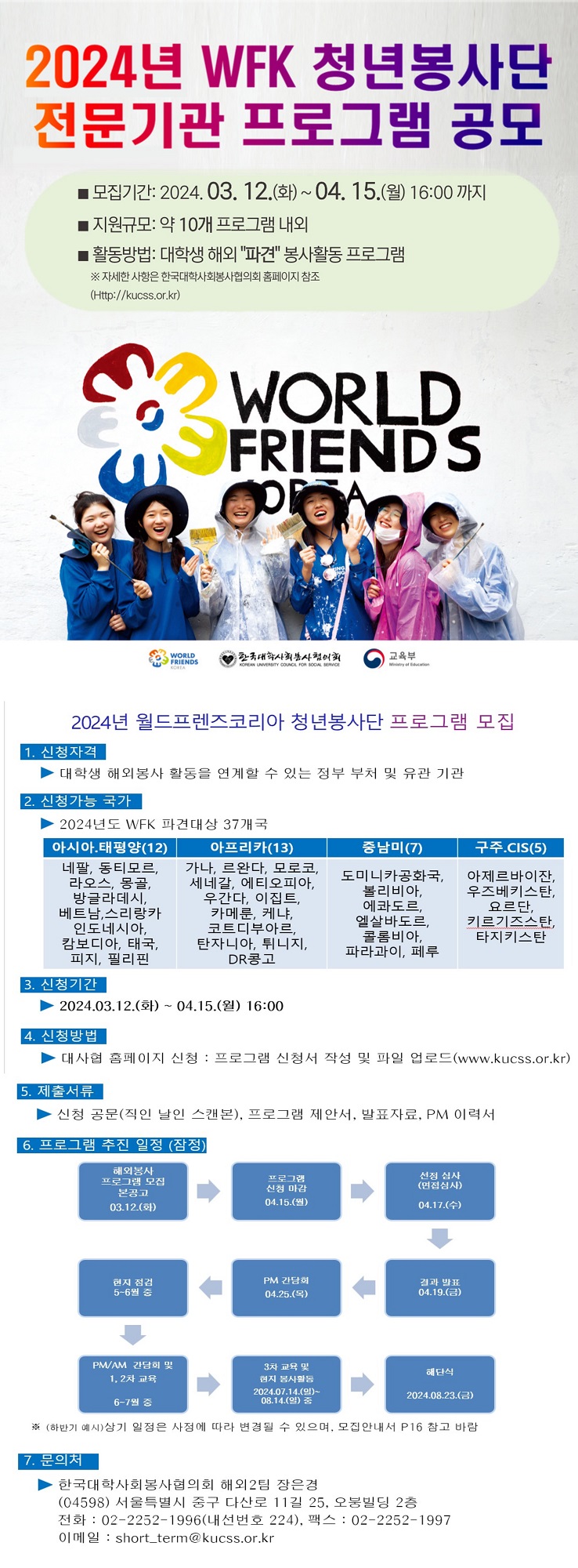 정보공유 [홍보] 2024년 WFK 청년봉사단 전문기관 프로그램 공모 관리자 2024.03.12 1233 이전글 [홍보] 2024년 「제48회 청백봉사상」 공모 목록 다음글 [홍보] 2024 초록우산X다음세대재단 '아동・청소년 비영리스타트업 인큐베이팅 사업' 공고