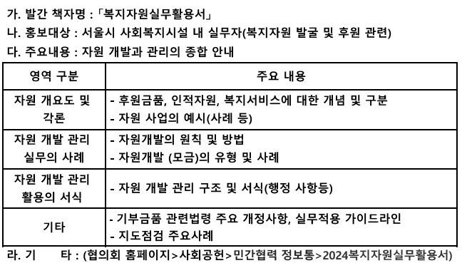[홍보] 민간자원 개발과 관리를 위한 복지자원활용실무서 발간 안내