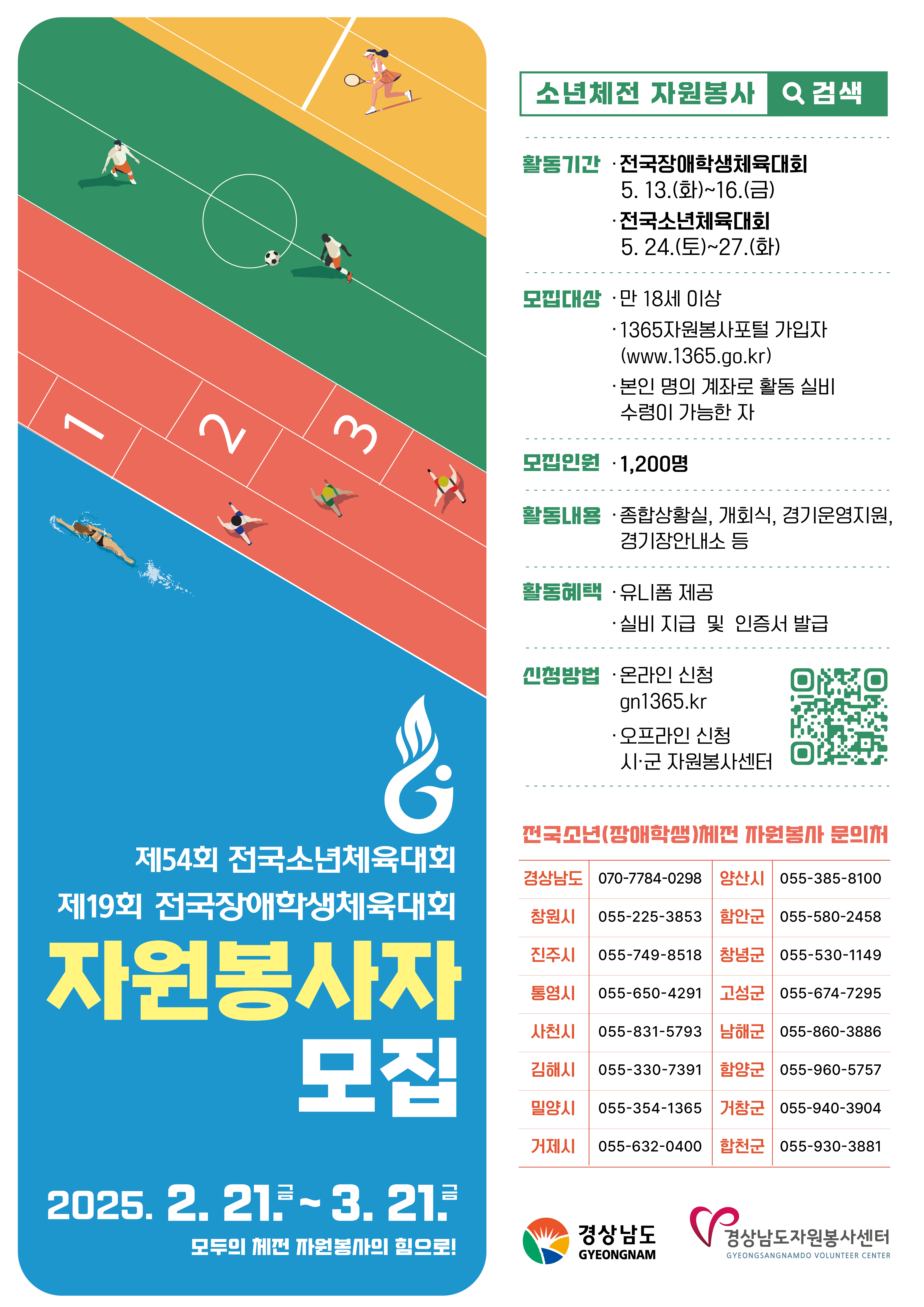 경상남도 자원봉사센터에서는 [제54회 전국소년체육대회 및 제19회 전국장애학생체육대회]의 성공적인 개최를 위하여 자원봉사자를 모집하고 있으니, 많은 관심과 신청 부탁드립니다.