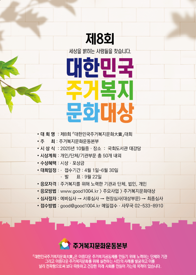 정보공유 [홍보] 제8회 대한민국주거복지문화大賞 참가 안내 관리자 2025.04.01 630 이전글 [홍보] 2025 볼런투어(Voluntour) 아산 어때! 참여 안내 목록 다음글 [홍보] 부산광역시 청소년 정책 브랜드 네이밍 공모전 참가 안내