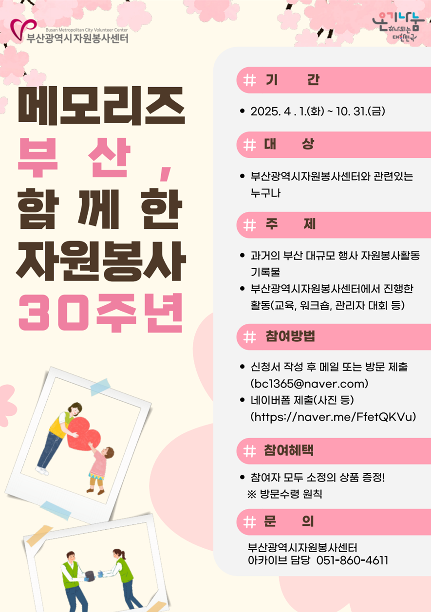 2026년 부산광역시자원봉사센터 30주년을 기념하여 아카이브 자료 수집 이벤트 '메모리즈 부산, 함께한 자원봉사 30년'을 진행하오니 많은 관심과 참여부탁드립니다.