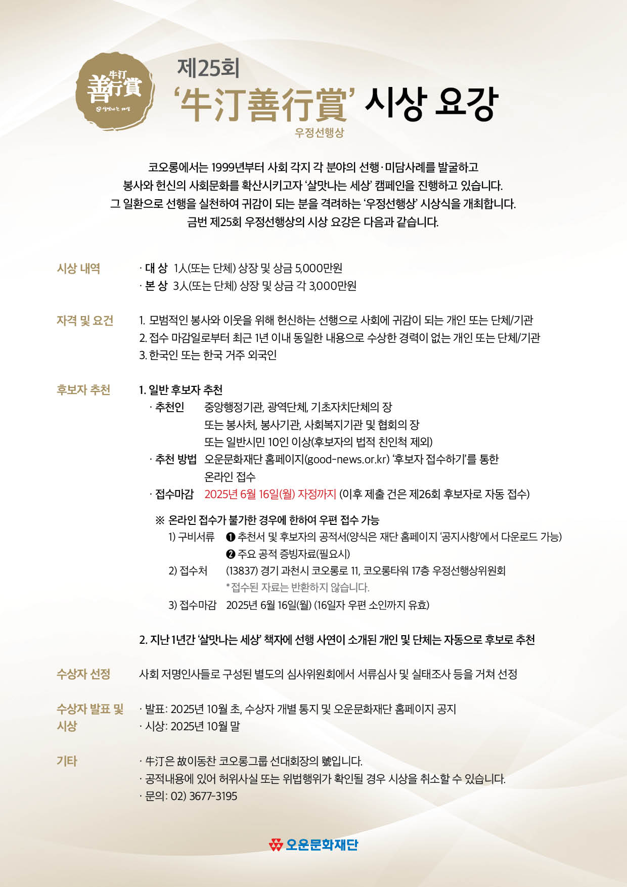 정보공유 [홍보] 제25회 우정선행상 후보자 추천 안내 관리자 2025.05.09 529 이전글 [홍보] K-자원봉사의 중심, 경기도! 숏폼&캐릭터 공모전 참여 안내 목록 다음글 [홍보] 라이나전성기재단 '2025 스프링보드 지원사업' 참여기관 모집 안내