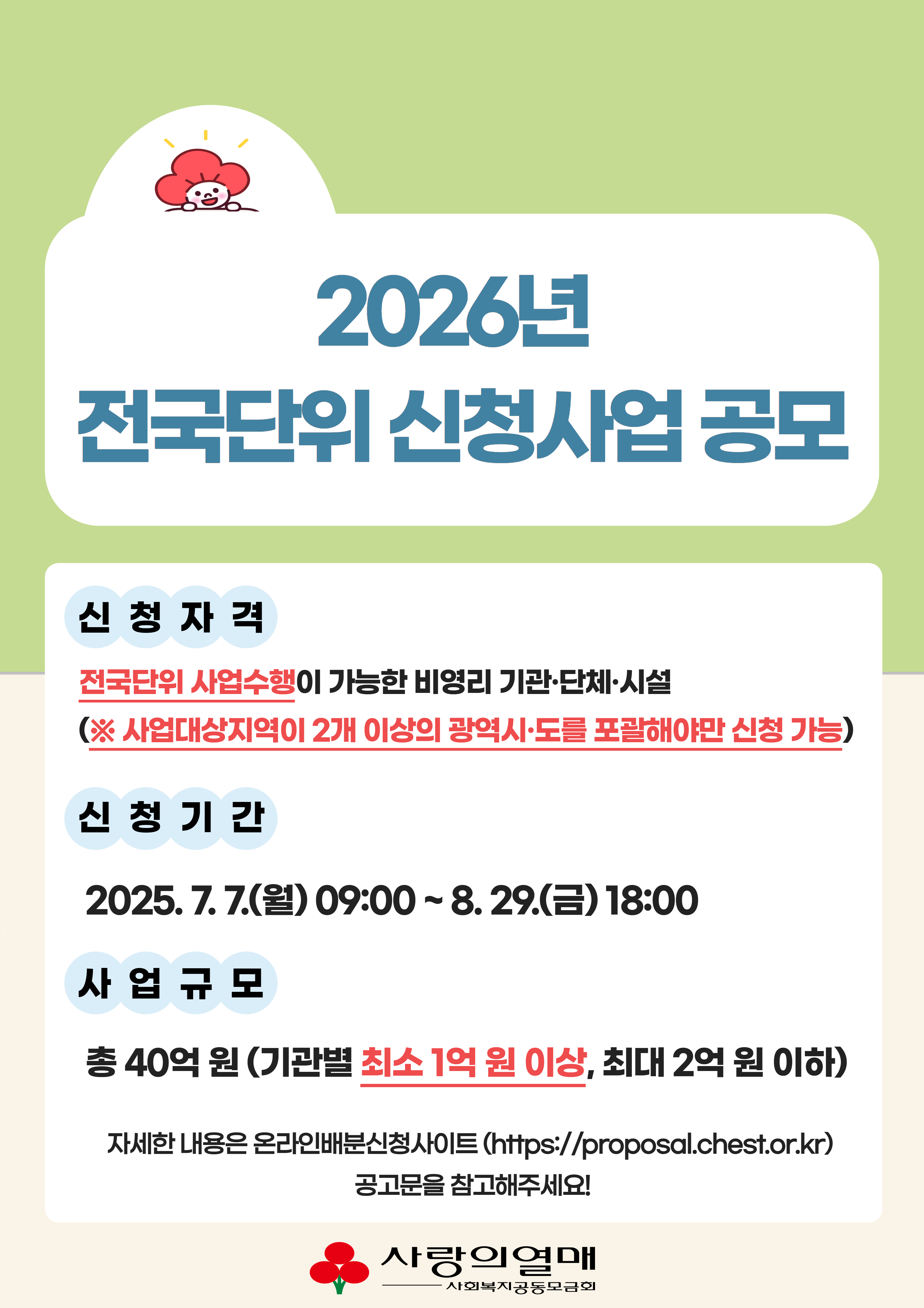 정보공유 [홍보] 사회복지공동모금회, 2026년 전국단위 신청사업 안내 관리자 2025.07.10 170 이전글 [홍보] 2025년 사회서비스 소셜업 공모전 참여기업 모집 안내 목록 다음글 [홍보] AI 기반 기후·환경 혁신 아이디어 공모전 안내