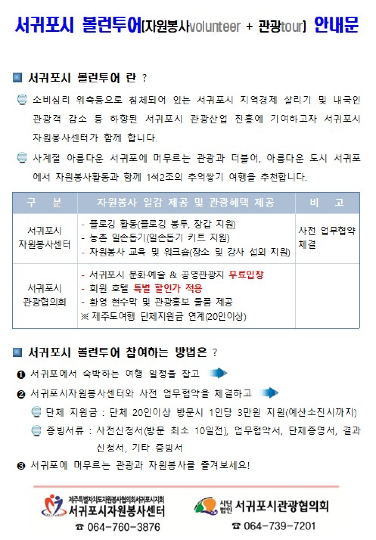 정보공유 [홍보] 서귀포시 볼런투어 안내 관리자 2026.02.12 63 서귀포시 문화⋅예술 이전글 [홍보] 제1회 롯데 mom편한 가족상 안내 목록 다음글 [홍보] 2026 한강공원 자원봉사자 모집 안내