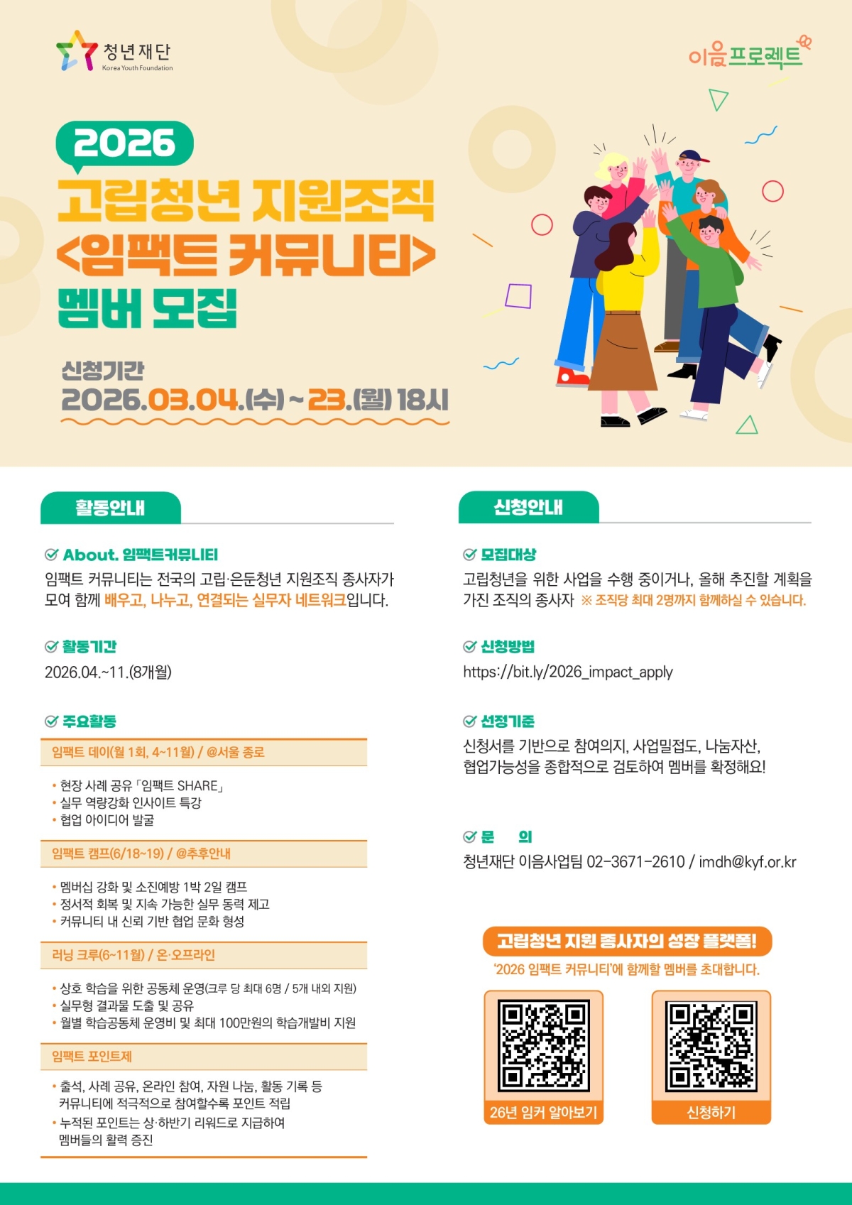 정보공유 2026 고립청년 지원조직 <임팩트 커뮤니티> 멤버 모집 관리자 2026.03.10 147 붙임1. 2026 고립청년 지원조직 임팩트 커뮤니티 모집계획(안)_260303(발송용).pdf 이전글 2026년 월드프렌즈코리아 청년봉사단 전문기관 프로그램 공모 안내 목록 다음글 2026 완주 산단 e스포츠 대회 참가자 모집 안내