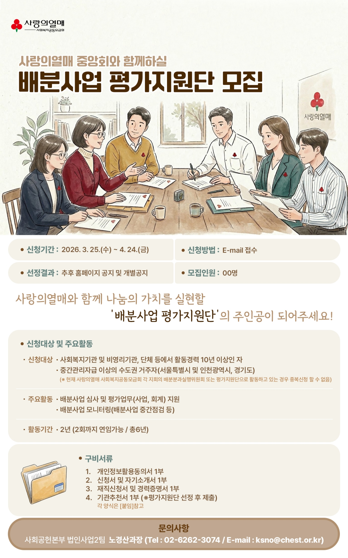 정보공유 2026 사랑의열매 배분사업 평가지원단 모집 안내 관리자 2026.03.26 98 1. 2026 사랑의열매 배분사업 평가지원단 신규단원 선발 공고문 및 신청양식.hwp 이전글 여수시 유앤기후변화협약 제3차 기후주간 자원봉사자 모집 안내 목록 다음글 2026년 월드프렌즈코리아 청년봉사단 전문기관 프로그램 공모 안내