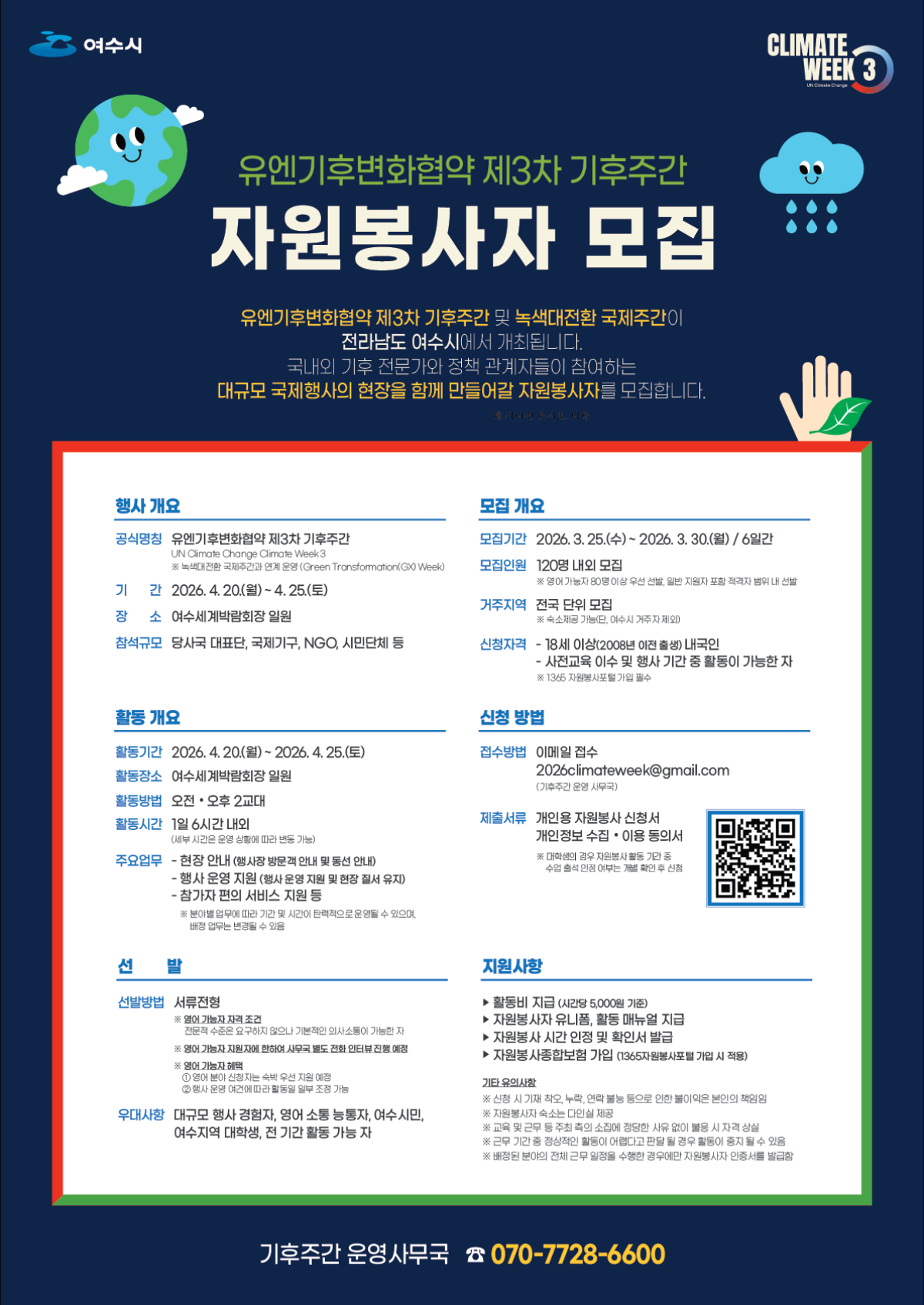 정보공유 여수시 유앤기후변화협약 제3차 기후주간 자원봉사자 모집 안내 관리자 2026.03.26 88 모집공고(안).hwpx 목록 다음글 2026 사랑의열매 배분사업 평가지원단 모집 안내