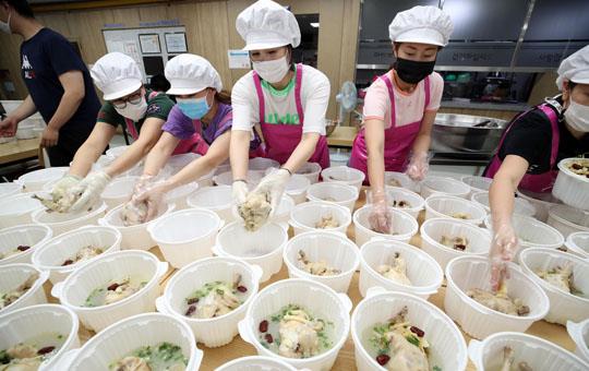 사진은 지난달 24일 대구 서구 원대동 서구제일종합사회복지관에서 자원봉사자들이 지역 소외계층 420명에게 나눠줄 삼계탕을 포장하고 있는 모습이다.