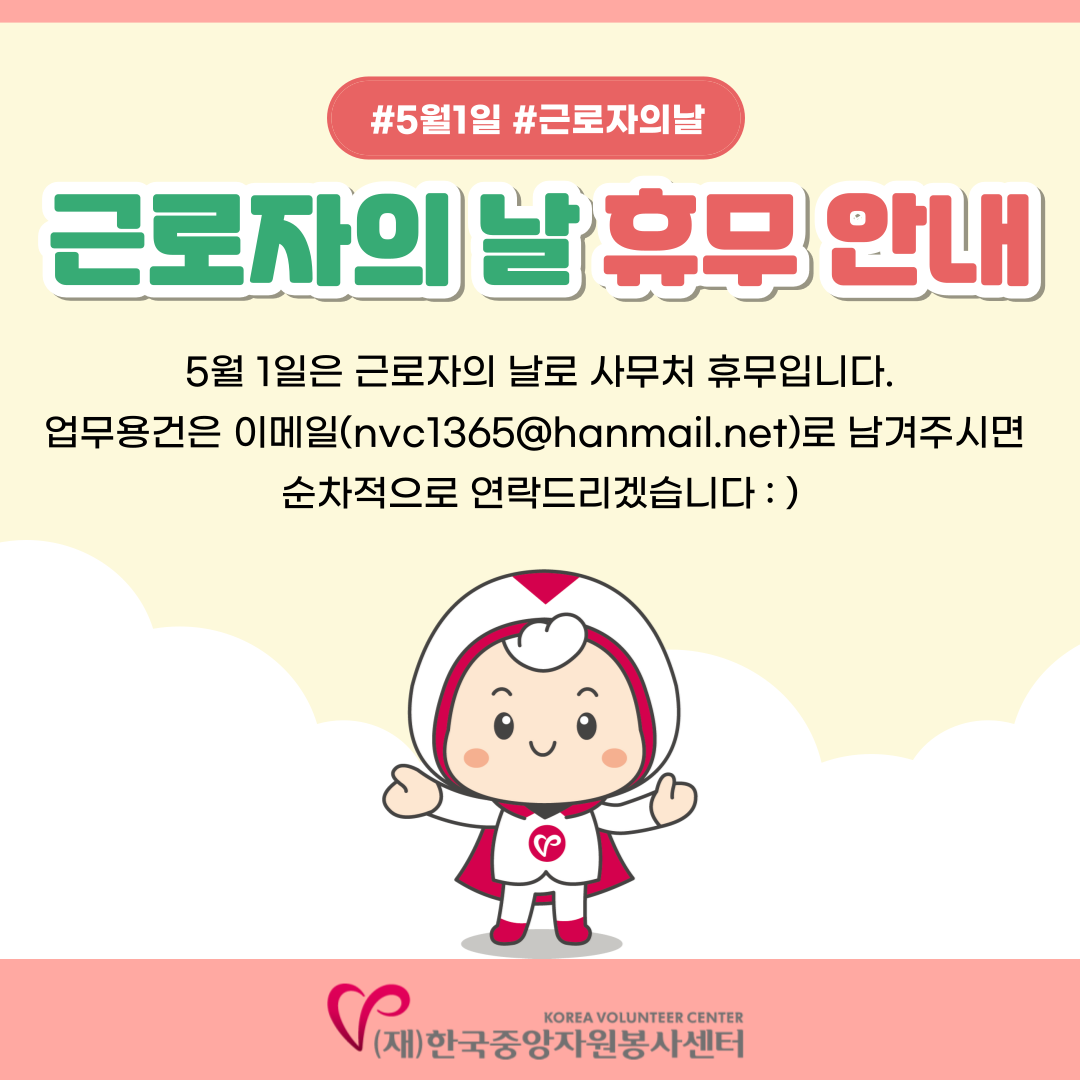 공지사항 [공지] 재단법인 한국중앙자원봉사센터 근로자의날 휴무 안내 2024.04.30 관리자 이전글 [공지] 2023년 공익법인 결산서류 등의 공시 목록 다음글 [공지] 지구를 위해 '당장'할 수 있는 봉사활동, 데이터플로깅 같이 해요 !