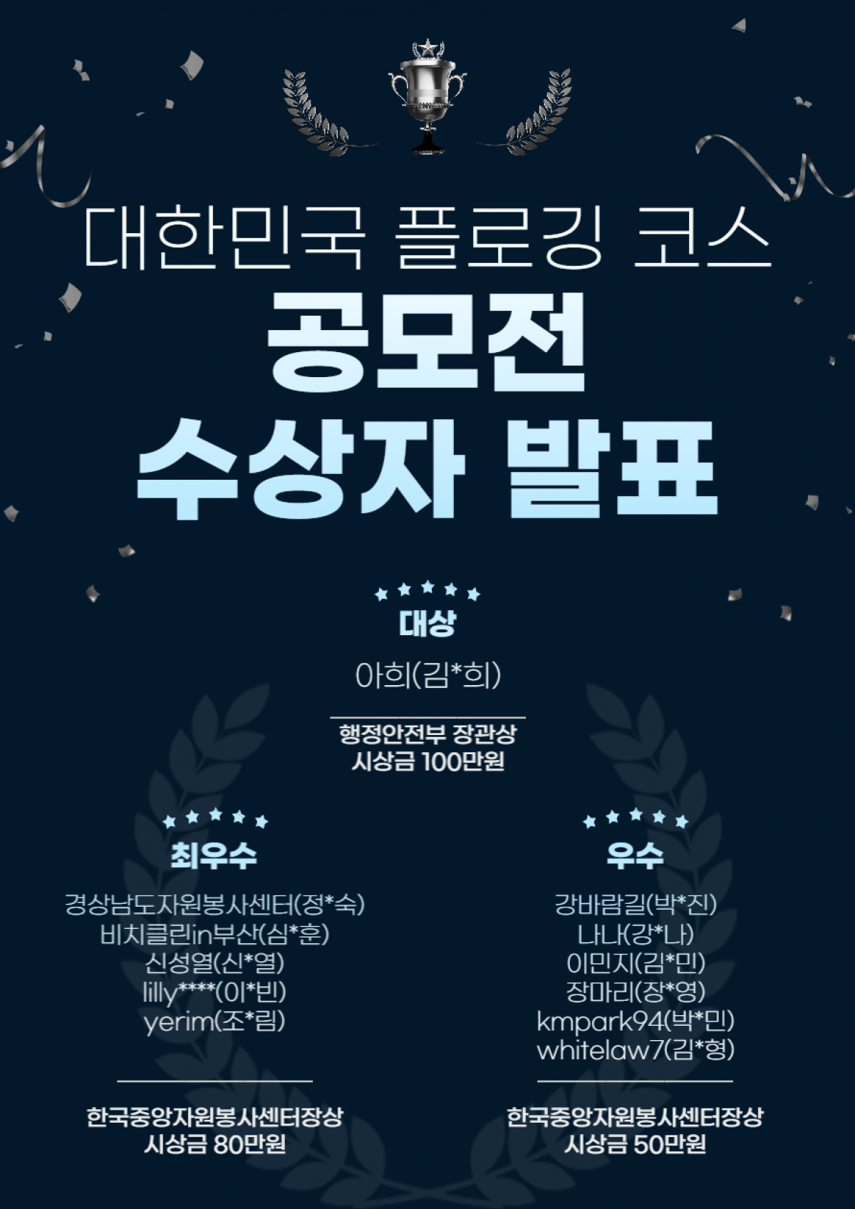 대한민국 플로깅 코스 공모전에 참여해주신 모든 참여자분들께 감사드리며,