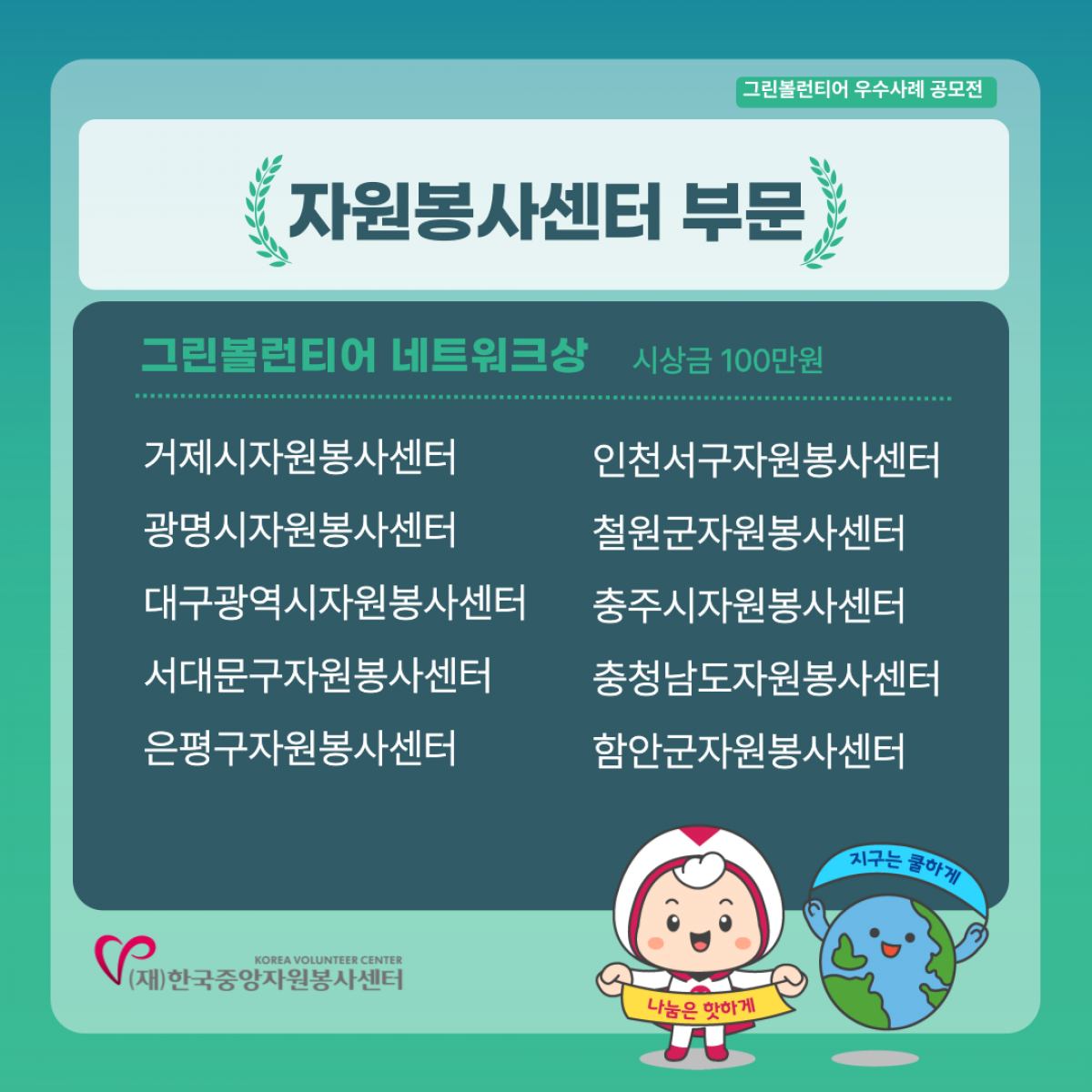 - 자원봉사센터 부문 : 선정 센터에 공문으로 별도 안내될 예정입니다.