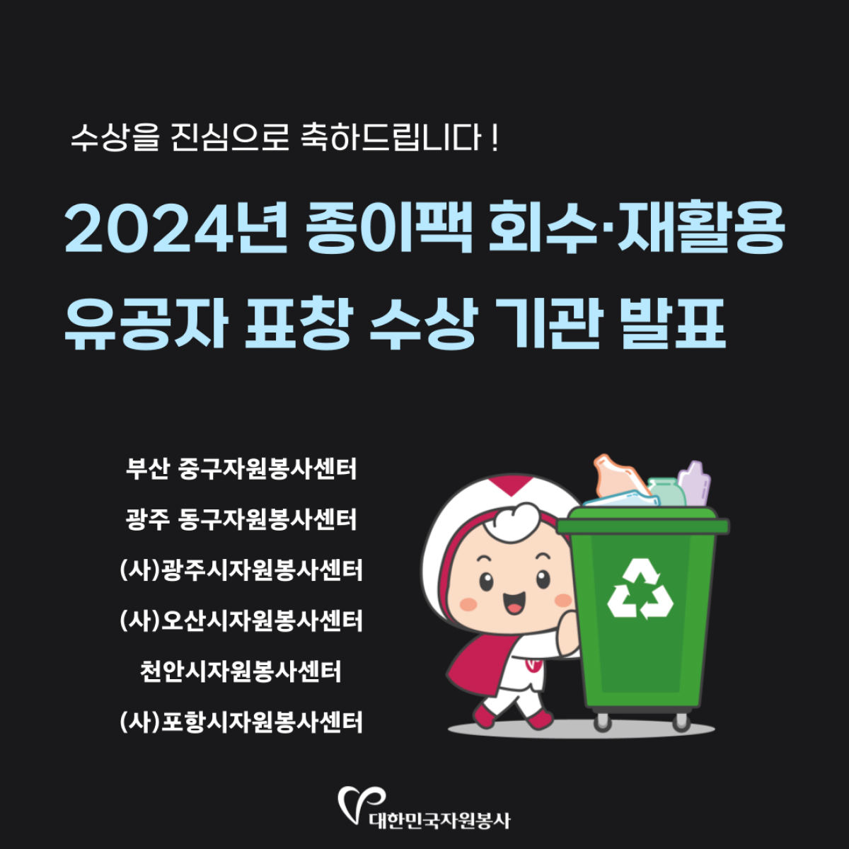 2024년 자원순환 자원봉사 지원사업에 참여해주신 모든 분들에게 감사드리며, 수상을 진심으로 축하드립니다.
