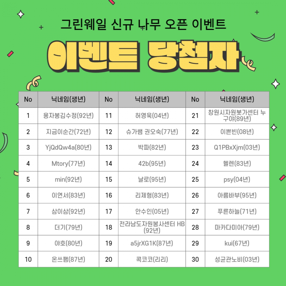 지난 11월 27일~12월 15일까지 진행된 "그린웨일 New 나무 캐릭터를 찾아라! " 이벤트에 참여해주신 모든 분들께 감사드립니다. 이벤트에 선정되신 분들 모두 축하드립니다!!