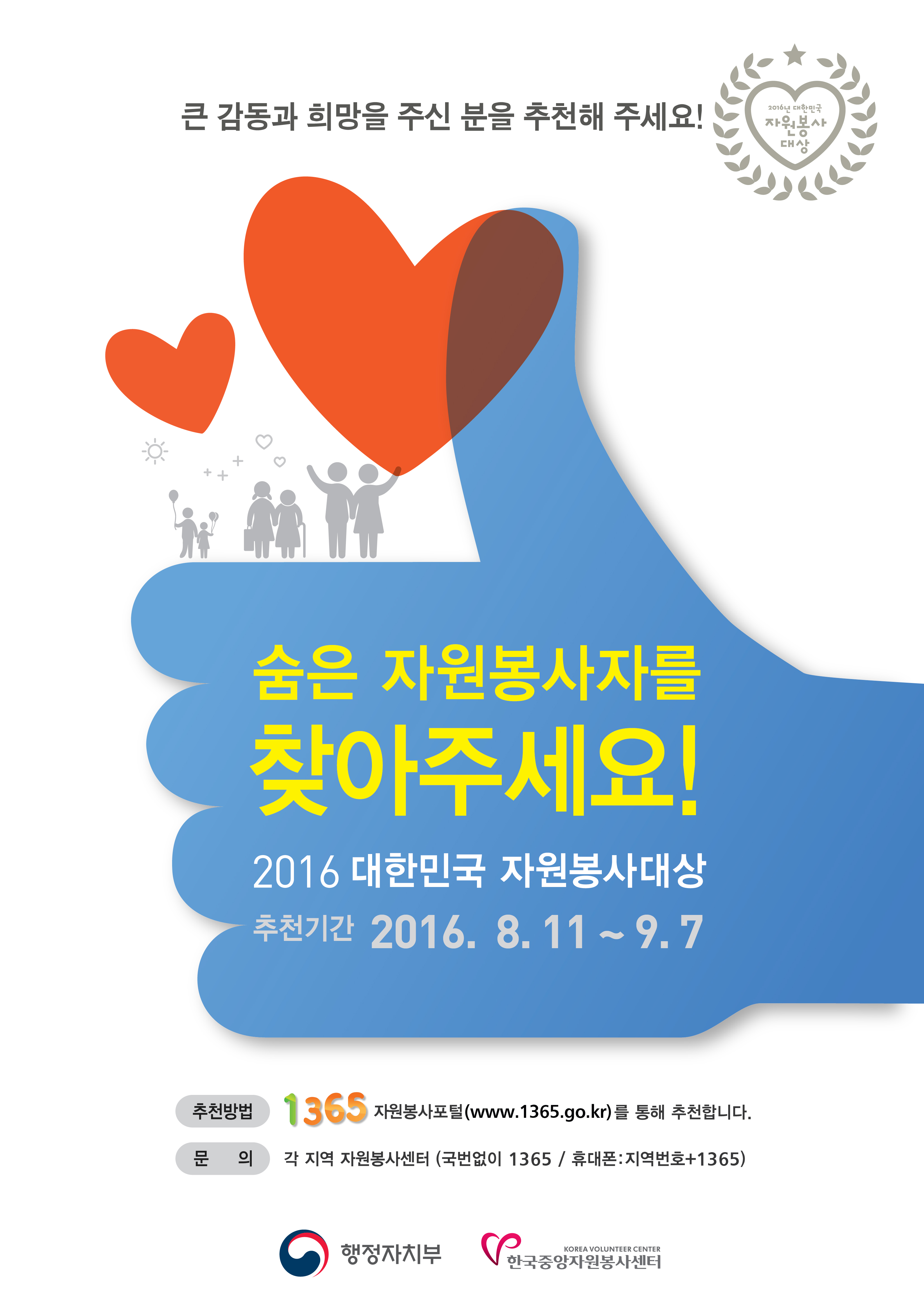 공지사항 2016년 대한민국 자원봉사대상 안내 2016.08.18 관리자 2016년 대한민국 자원봉사대상을 시행합니다. 아래 포스터를 클릭하시면 안내 페이지로 연결됩니다. 이전글 자원봉사 이그나이트 V-Korea 참여 안내 목록 다음글 이그나이트 V-Korea 우수사례 1차 서류심사 결과 안내