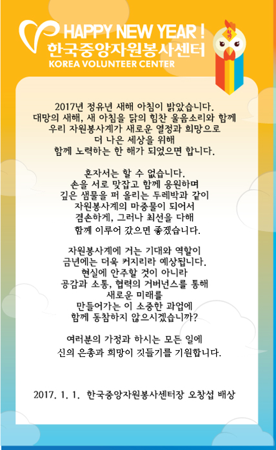 공지사항 [신년인사] 한국중앙자원봉사센터장님의 새해인사말씀 2017.01.02 관리자 이전글 설맞이 집중 자원봉사주간 안내 목록 다음글 [모집공고] 운이 좋은 그대에게 알려주는 나눔기자단 5기 모집안내