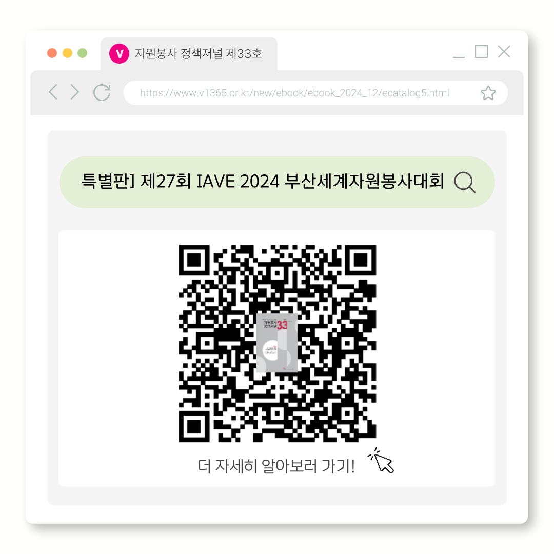 제33호 저널의 주제는 [특별판] 제27회 IAVE 2024 부산세계자원봉사대회 '인류의 힘, 자원봉사를 통해 만들어가는 지속가능한 미래'입니다.