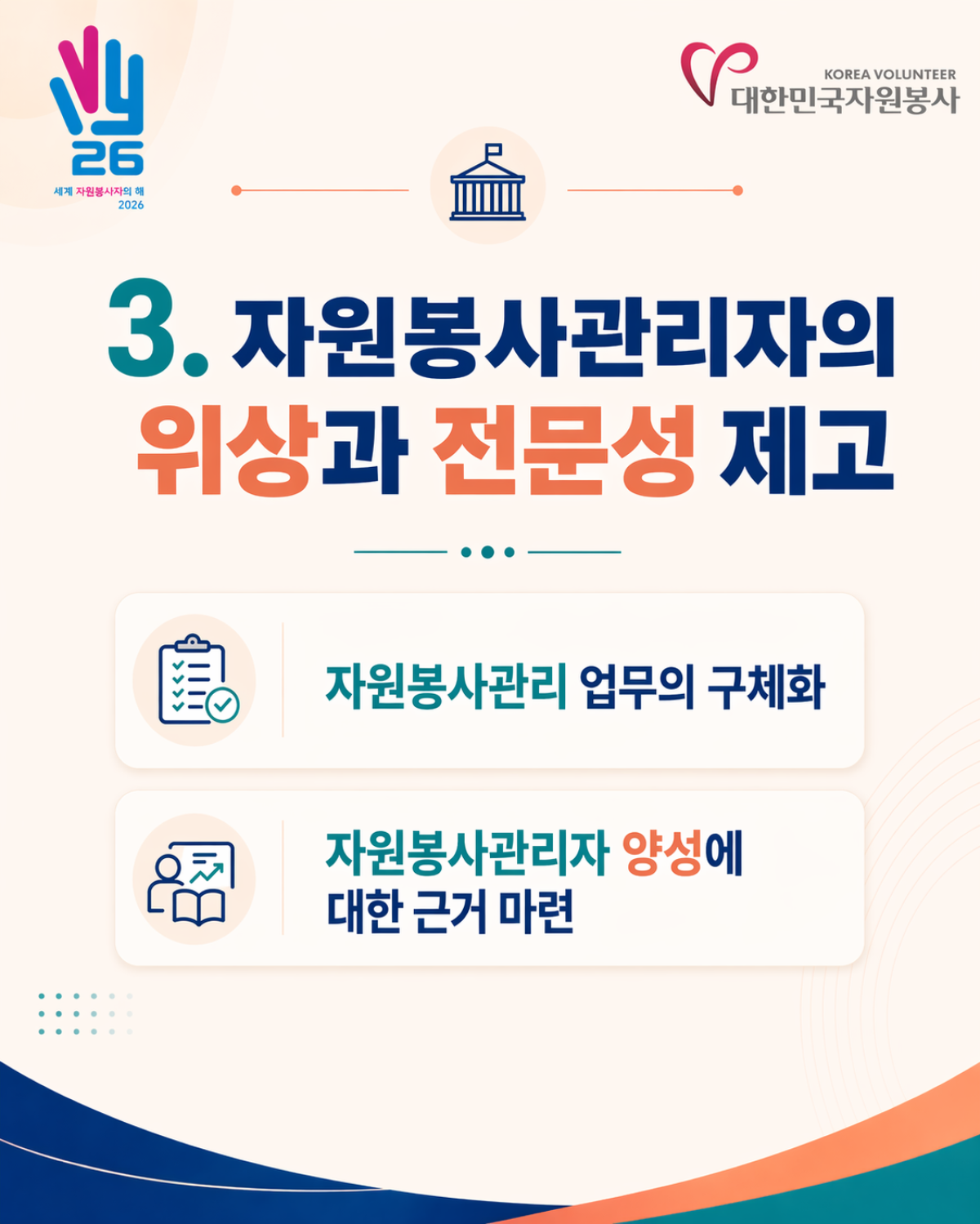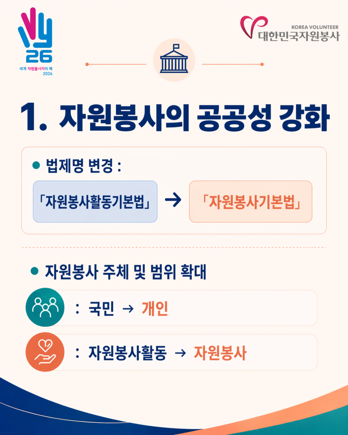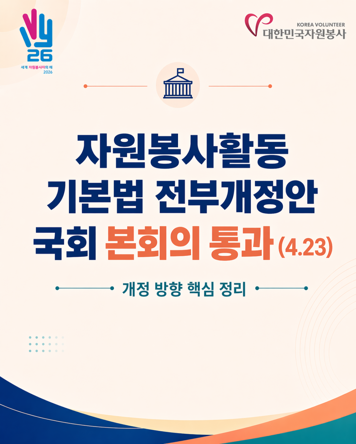 2026년 4월 23일! 지난 20여 년간 자원봉사계의 숙원 과제였던 「자원봉사 기본법」 전부개정안이 국회 본회의를 통과하였습니다. 세계 자원봉사자의 해(IVY 2026)를 맞아 이뤄진 이번 개정은 자원봉사의 공공성과 사회적 가치를 재정립하고, 자원봉사자 보호 및 관리체계의 전문성을 제고하는 계기이자 자원봉사계가 한 단계 도약하는 중요한 전환점이 될 것입니다.