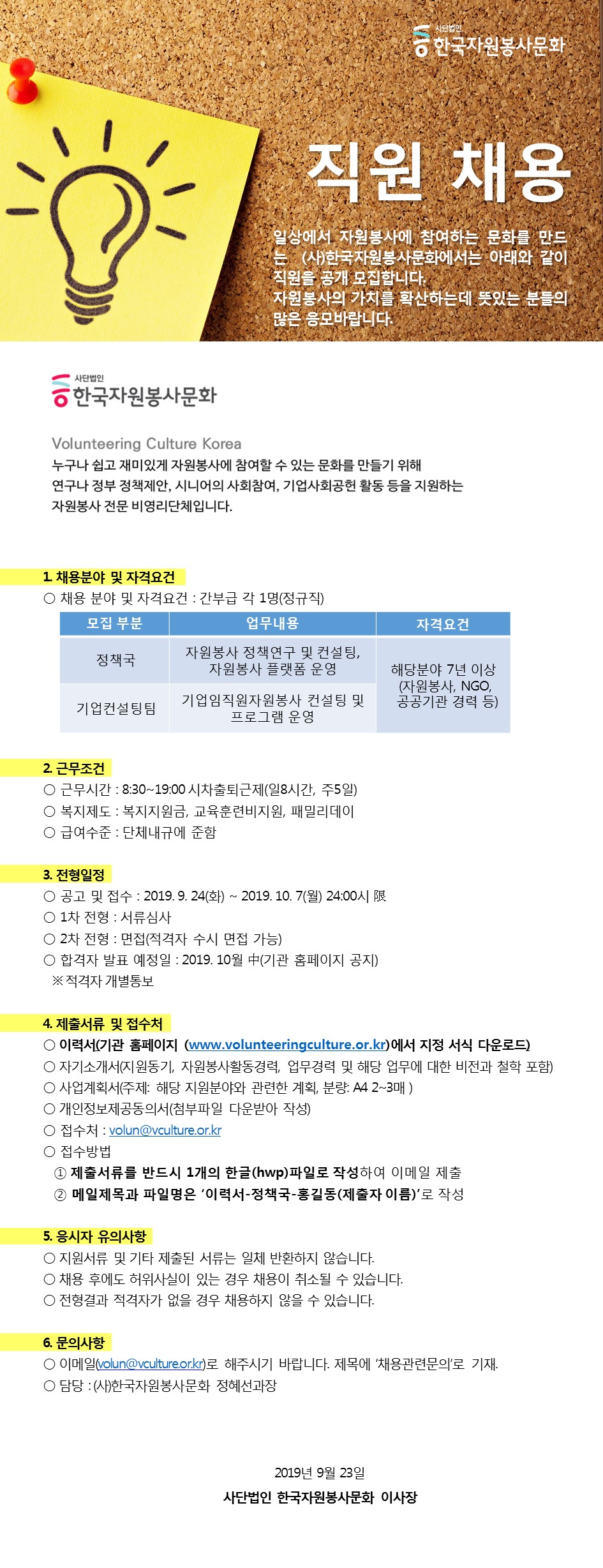 입찰/채용 [홍보] (사)한국자원봉사문화 채용 재공고 2019.09.26 관리자 채용 재공고 정규직(정책국,기업컨설팅팀).hwp 이력서 서식.hwp 개인정보제공동의서 서식.hwp 이전글 [홍보] 경상북도종합자원봉사센터 신입직원 통합채용시험 공고 목록 다음글 [공지] 「재난현장자원봉사센터 운영을 위한 법·제도 연구」 용역 제안 결과 공지(용역공고 2019 - 06호)