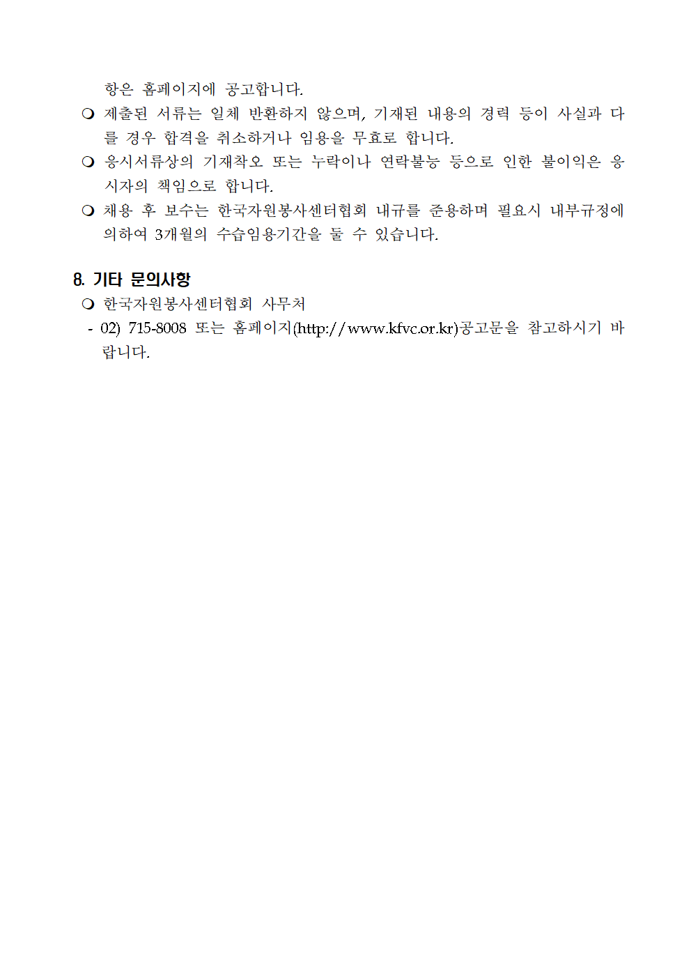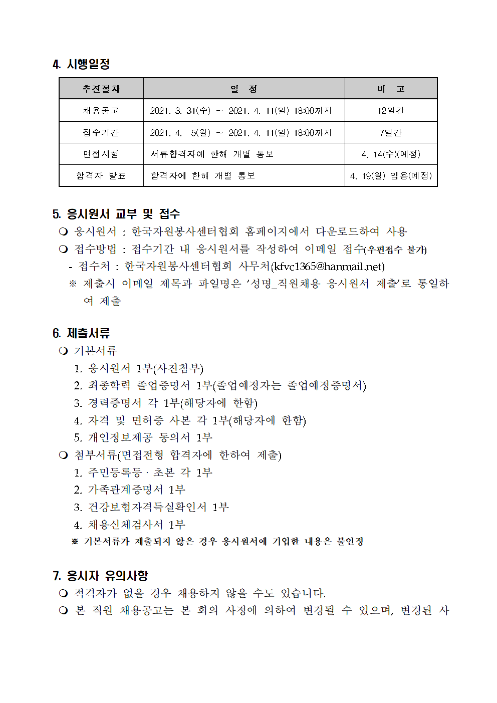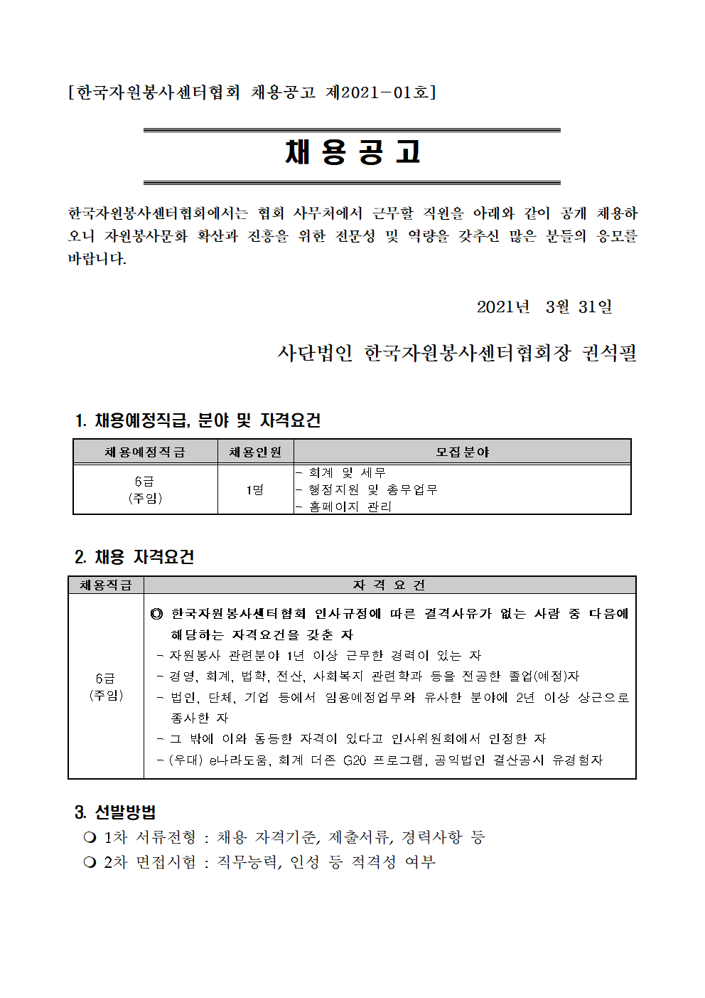 입찰/채용 (채용_홍보) 한국자원봉사센터협회 사무처 직원 채용 2021.04.02 관리자 [채용공고 제2021-01호] 한국자원봉사센터협회 사무처 직원 채용.hwp 이전글 (채용_홍보) 한국자원봉사센터협회 사무처 직원 채용 재공고 목록 다음글 (공고 제2021-003호) 2021년 자원봉사종합보험 통합계약 제안서 평가 결과