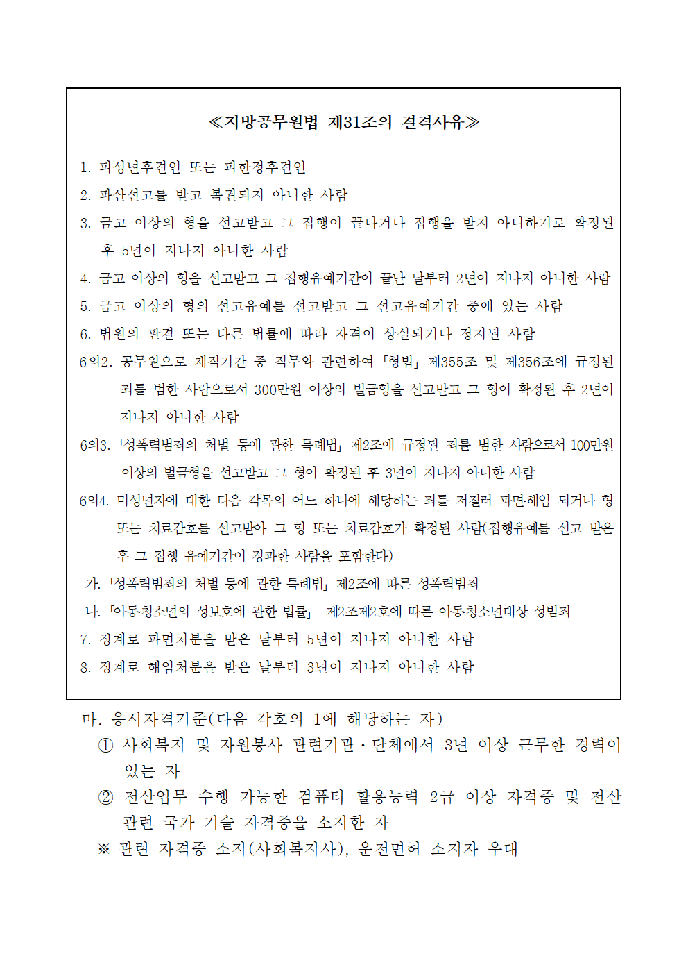 입찰/채용 (채용_홍보) 2021 양주시자원봉사센터 직원 채용시험 공고 2021.06.14 관리자 붙임. 2021 양주시자원봉사센터 직원 채용시험 공고.hwp 이전글 (채용 제2021-003호) 재단법인 한국중앙자원봉사센터 2021년도 제3차 직원 채용 결과 안내 목록 다음글 (채용_홍보) 한국자원봉사센터협회 사무처 경력직 직원 채용 재공고