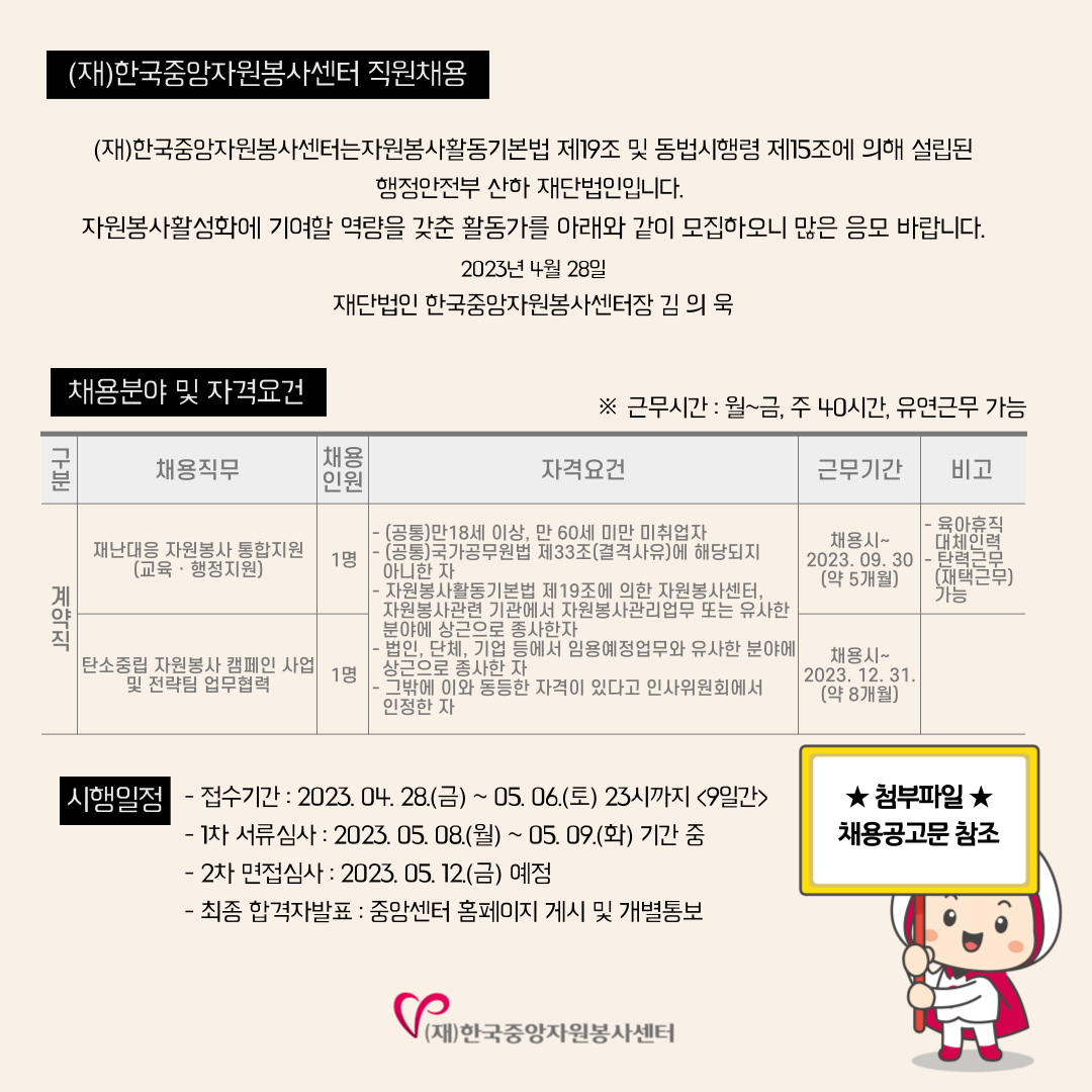 입찰/채용 [채용] (제2023-001호) 재단법인 한국중앙자원봉사센터 직원채용 공고(계약직) 2023.04.28 관리자 2023년 제1차 직원채용 모집공고문 및 응시원서.hwp 이전글 [공고] (제2023-006호) 웨일 브라우저 기반 온라인 식목 캠페인 앱 개발 입찰 공고 목록 다음글 [채용] (사)경상북도종합자원봉사센터 직원(정규직) 채용 공고 안내